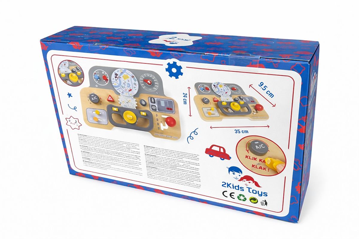 Mama, Papa, heute fahre ich! Diese Spieltafel bietet viel Spaß, mit dem Ihr Kind seine Geschicklichkeit, Neugier und insbesondere die Feinmotorik entwickeln kann. Interaktive Elemente wie Knöpfe oder drehbare Räder geben dem Kind die Möglichkeit, verschiedene Bewegungen wie Schieben, Drehen oder Klicken zu üben und sich so auf alltägliche Aufgaben vorzubereiten. Neben Aktivitäten, die die Sinnesfähigkeiten einbeziehen, verfügt die Tafel über ein Lenkrad - eine großartige Möglichkeit, das fantasievolle Spiel noch weiter zu fördern. Und außerdem können sie auf der Fahrt auch hupen. Die Fahrt wird weit sein! Hauptmerkmale: unterstützt Unabhängigkeit, Feinmotorik und Hand-Auge-Koordination, fördert kreatives Denken und die Entwicklung der Vorstellungskraft, sensorische Stimulation, Bildung durch Spiel, stilvolles Design, das Jungen und Mädchen begeistert, gibt ein Hupgeräusch von sich