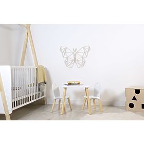 Geometrische Holzfigur in Form eines Schmetterlings. Hängende Dekoration aus Sperrholz eignet sich für ein Kinderzimmer im skandinavischen Stil.