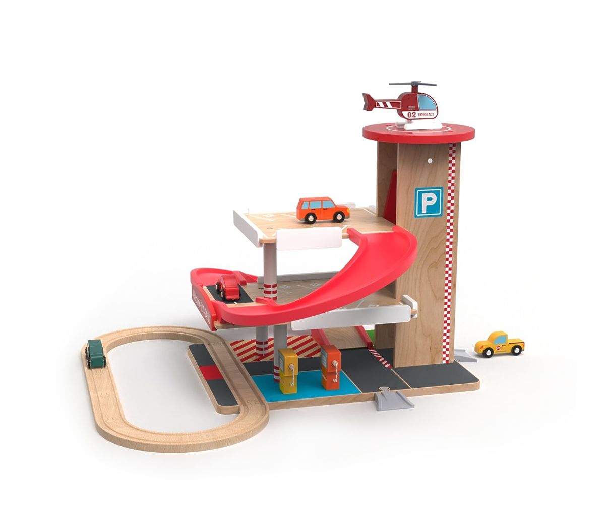 Alle Automobilenthusiasten werden strahlende Augen bekommen, wenn sie die bunte Garage mit Aufzug und Hubschrauberlandeplatz sehen. Tanken Sie umweltfreundlich an der Zapfsäule im Erdgeschoss. Fahren Sie Ihr Fahrzeug mit dem kurbelbetriebenen Aufzug nach oben und beobachten Sie, wie es die Rampe hinunterfährt und weiter auf der Strecke rollt. Ein Unfall ist passiert? Vom Hubschrauberlandeplatz auf dem Dach startet bereits der Hubschrauber. Dieses lehrreiche Spielzeug motiviert Kinder zu kreativem und fantasievollem Spiel. Es fördert die Hand-Auge-Koordination, Feinmotorik und Geschicklichkeit. Die Garage mit Parkflächen auf drei Ebenen enthält auch 4 Autos und einen Hubschrauber. Hauptmerkmale: Garage mit Hubschrauberlandeplatz und Aufzug, 3 Parkflächen, 4 Autos, 2 Tankstellen, 1 Elektrotankstelle, Hubschrauber, Schienen. Inspiriert zu kreativem und fantasievollem Spiel. Fördert die Hand-Auge-Koordination, Feinmotorik und Geschicklichkeit.