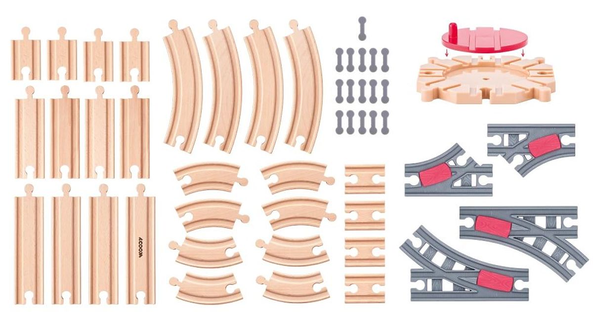 Die Gleiselemente sind mit Produkten anderer Hersteller wie Brio, IKEA, ELC, Little Steps, Eichhorn, Woodyland, Tesco, Carousel, Bigjigs usw. kompatibel, sodass das Gleis leicht erweitert oder mit einem anderen Gleis verbunden werden kann.