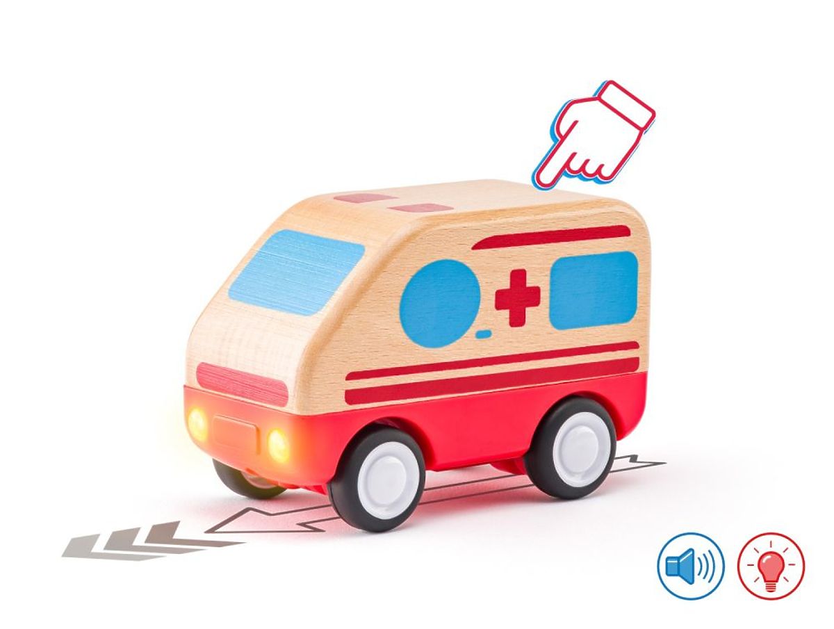 Die neue Fahrzeugkollektion der Marke Woody sind Autos, die in ihrer Größe an kleine Hände angepasst sind. Sie sind aus Holz mit Plastikelementen gefertigt und mit kindersicheren Farben bemalt. Sie haben weiche Gummireifen, die für eine gute Haftung auf der Oberfläche sorgen. Beim Drücken des Autos leuchten die Lichter auf, das Signal ertönt und das Fahrzeug beginnt sich zu bewegen. Im Lieferumfang sind 3 LR44 1,5 V Batterien enthalten.