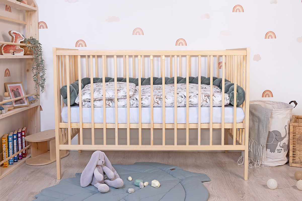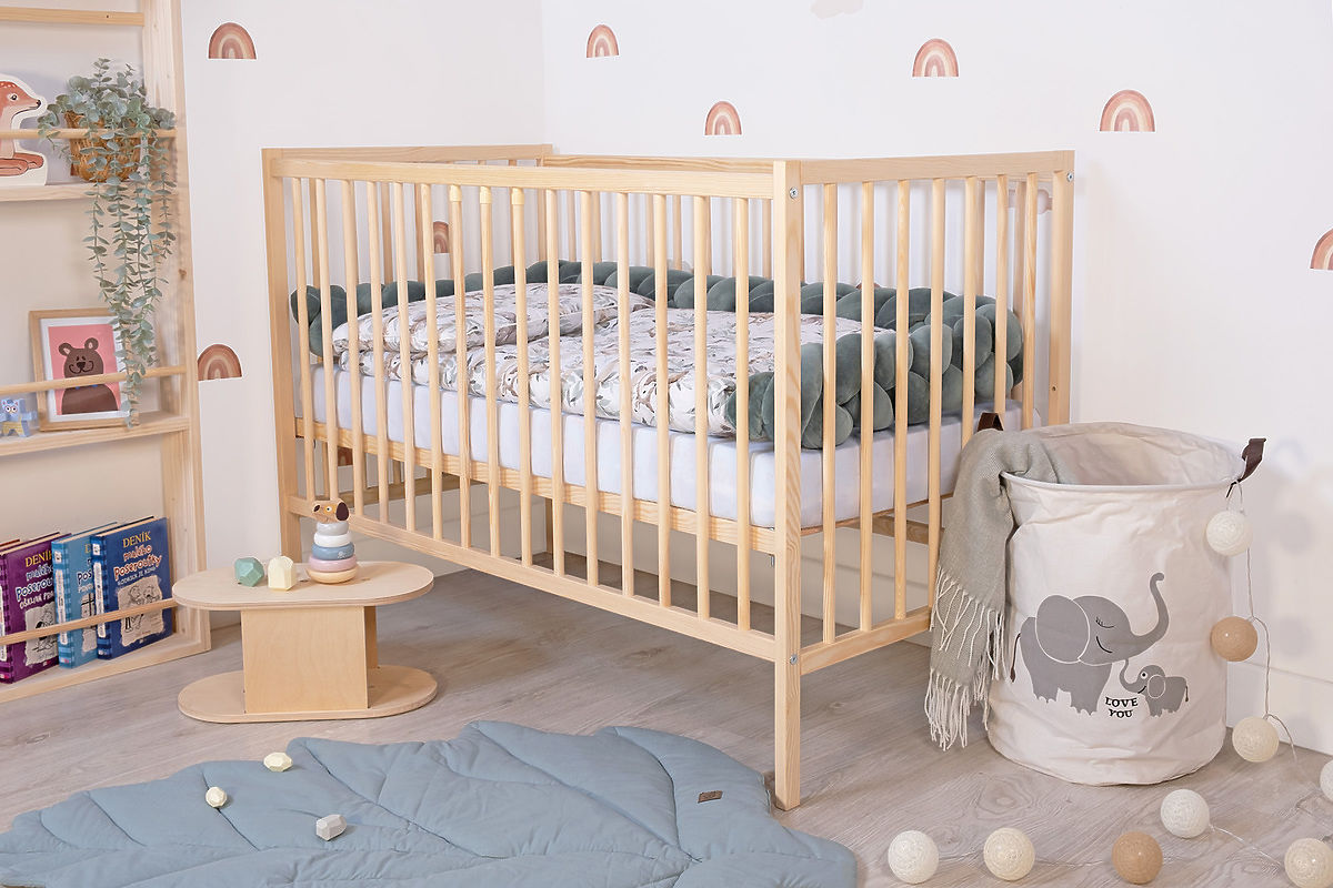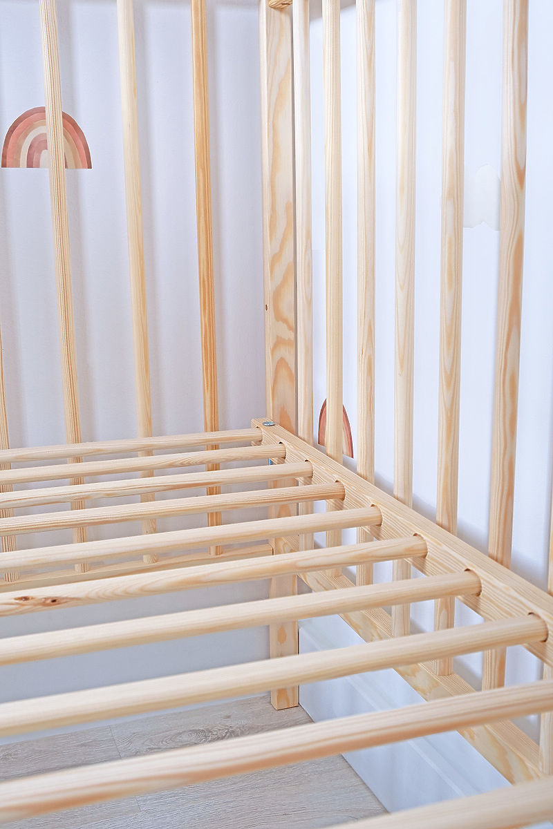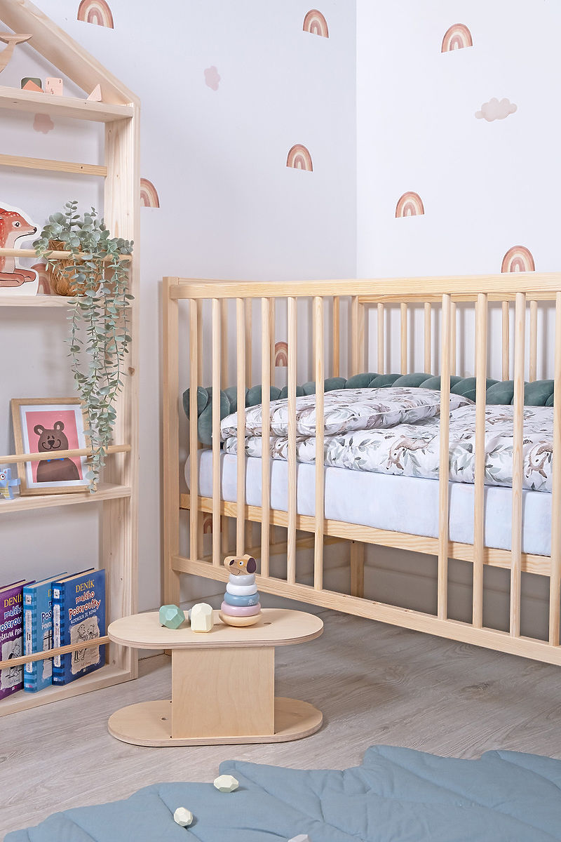 Das klassische hölzerne Bettchen Standard in Naturfarbe zeichnet sich durch seine Einfachheit aus und ist sowohl für kleine Jungen als auch Mädchen geeignet. Das natürliche Aussehen des Bettchens kommt am besten in einem skandinavisch gestalteten Kinderzimmer zur Geltung.