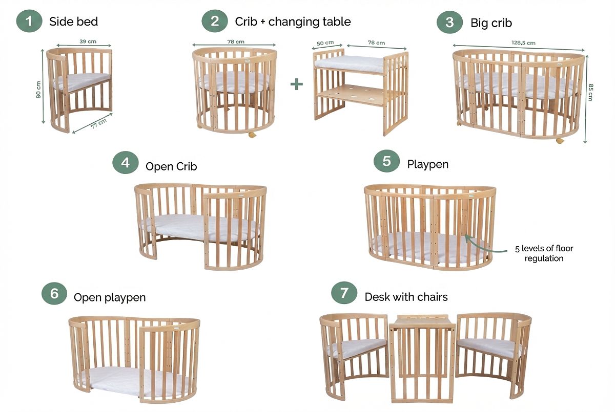 Investieren Sie in einzigartigen Komfort für Ihr Baby. Das ovale Anzuchtbeet Ruby 7 in 1 PLUS in Naturfarbe ist praktisch, elegant und sehr langlebig. Es besteht aus sorgfältig ausgewählten Materialien und garantiert Ihrem Kleinen Sicherheit und Komfort von den ersten Lebenstagen bis zum 10. Lebensjahr.