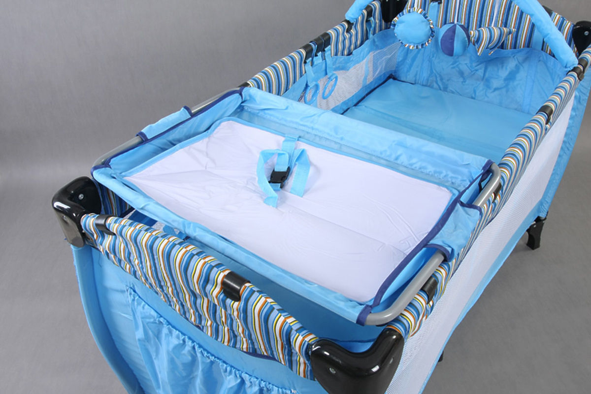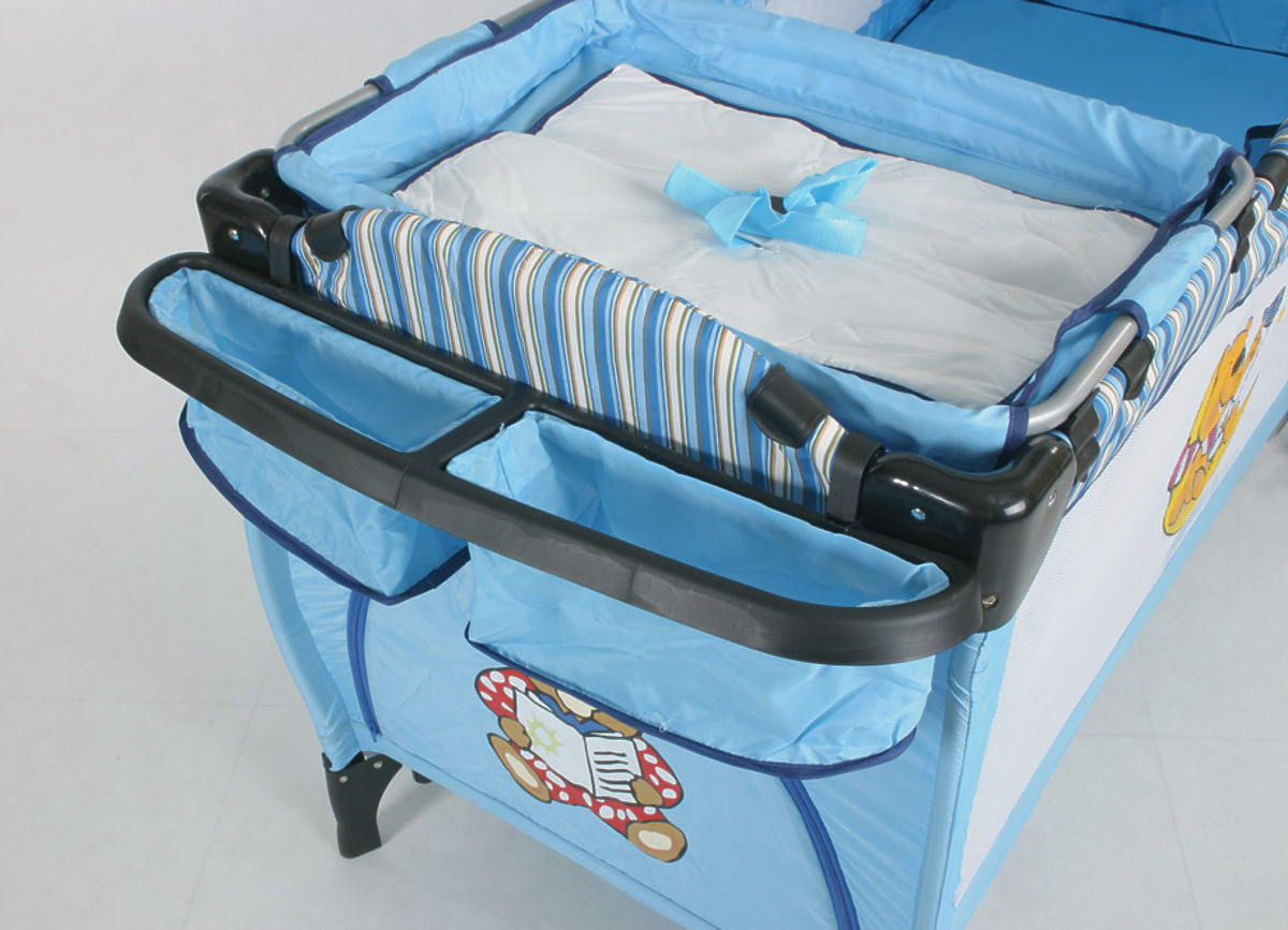 Reisebett hat auch ein Vordach mit Spielzeug, das die Aufmerksamkeit eines Kindes zieht. Moskitonetz verhindert, dass Kinder von Insekten, große Seitentasche für Zubehör und Kleinteile ist groß. Der seitliche Abschnitt öffnet, können die Kinder bequem klettern aus der Krippe.