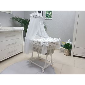 Der Weidenkorb für das Baby wird zu einer praktischen und schönen Dekoration des Kinderzimmers. Der Korb steht auf einer stabilen Holzkonstruktion, die mit Rollen mit der Möglichkeit des Bremsens ausgestattet ist. Umfangreiches Zubehör ist ebenfalls enthalten.