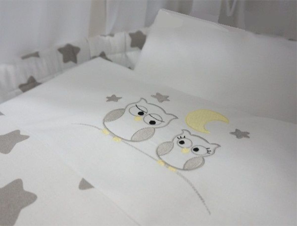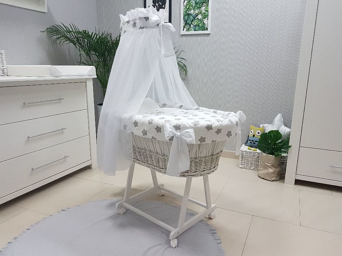Weidenkorb in Weiß inklusive Bettwäsche mit grauem Eulenmuster. Sser Babykorb ist eine schöne Alternative zum Kinderbett. Ein Weidenkorb für Kinder bis zu einer Körpergröße von 60 cm (von der Geburt bis zu einem halben Jahr) kann für ungestörten und komfortablen Schlaf verwendet werden.
