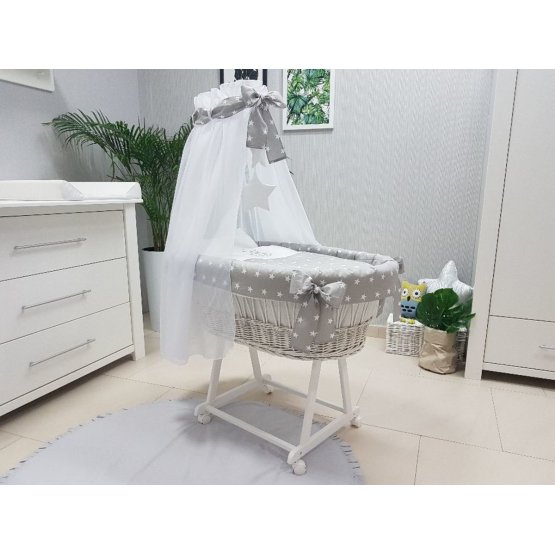 Weidenkorb in Weiß mit grauer Sternmusterbettwäsche. Sser Korb dient auch als schöne Alternative zum Babybett. Ein Weidenkorb für Kinder bis zu einer Körpergröße von 60 cm (von der Geburt bis zu einem halben Jahr) kann für ungestörten und komfortablen Schlaf verwendet werden.