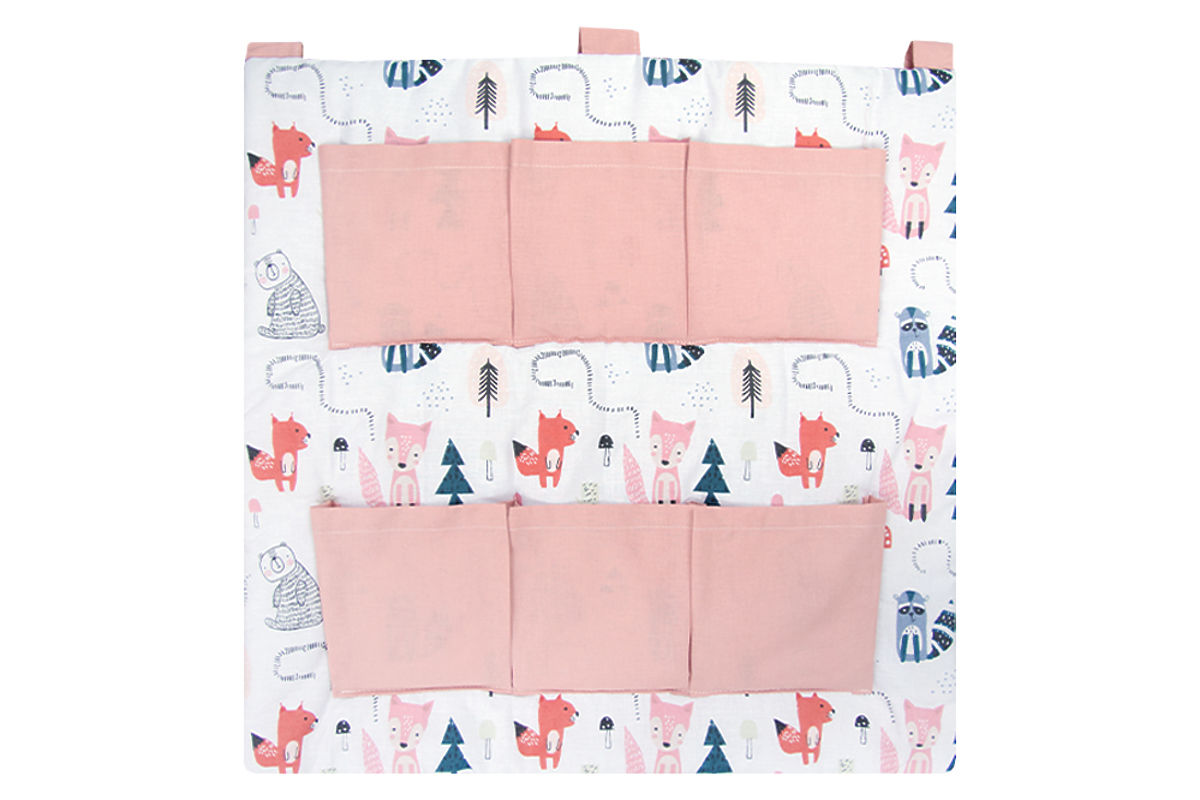 Der Taschendieb ist mit einem schönen Motiv von Füchsen und ihren tierischen Freunden verziert, und die Taschen haben eine angenehme rosa Farbe. Dank der universellen Pastellfarben passt es perfekt in jeden Raum.
