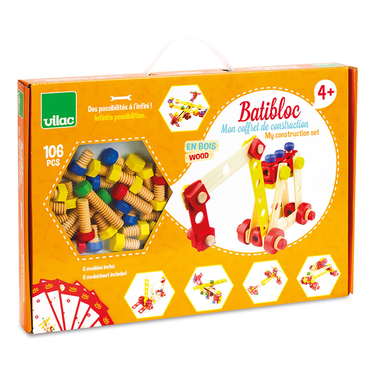 Bausatz aus Massivholz. Enthält 106 verschiedenfarbige und natürliche Platten, Schrauben, Muttern und Werkzeuge, die Kindern helfen, ihre Fantasie zu entwickeln. Das Paket enthält außerdem sechs Bauanleitungen. Eine komplette Box, die sich ideal als erster Holzbausatz für Ihr Kind eignet. Hauptmerkmale: Enthält 106 Teile in verschiedenen Farben, unterstützt Kreativität und räumliches Vorstellungsvermögen