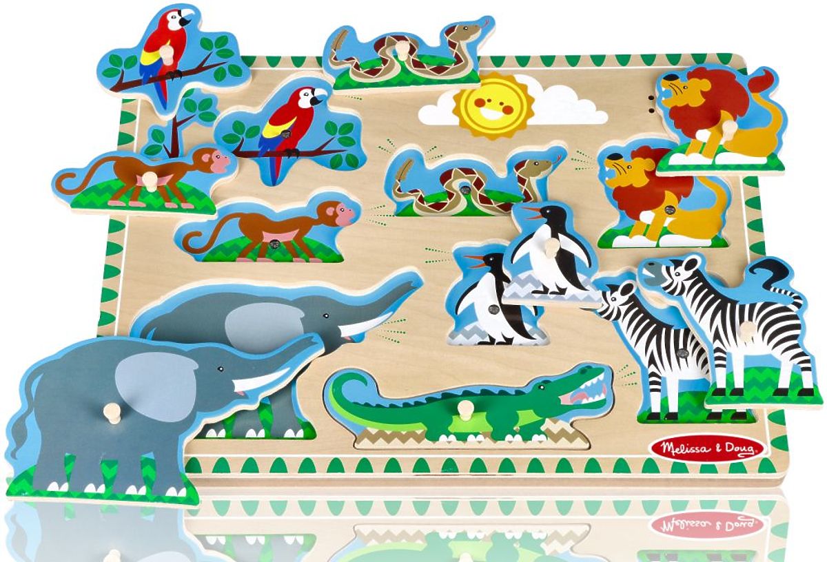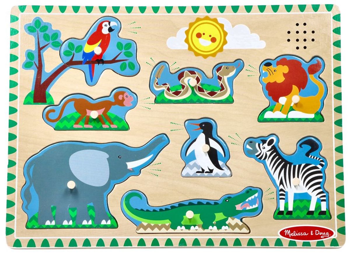 Das Kind spielt mit dem Puzzle und passt die Teile in die leeren Stellen ein. Wenn das Tier an seinen Platz gesetzt wird, hört das Kind einen Ton. Der Ton ist auf das jeweilige Tier abgestimmt. Der Löwe brüllt, der Elefant trompetet, die Schlange zischt usw.