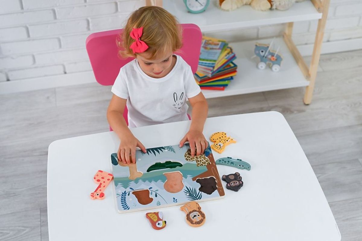 Aber das ist noch nicht alles, denn das Innere jedes Puzzlelochs ist mit einem Material ausgekleidet, das in Farbe oder Textur dem Fell des jeweiligen Tieres ähnelt. Wie fühlt sich das Fell eines Geparden an und wie die Haut eines Krokodils? Das erfährt das Kind auch beim Spielen mit diesem Puzzle. Das Spiel mit Gegenständen unterschiedlicher Texturen stimuliert nicht nur das Sehen, sondern auch den Tastsinn. Das Puzzle ist aus lackiertem Holz in angenehmen Farben gefertigt. Das Spielzeug fördert hervorragend die kindliche Vorstellungskraft, lehrt Konzentration und Beobachtung. Dank der Tatsache, dass die Figuren ausreichend dick sind, können sie nach dem Herausnehmen aufgestellt und weiter bespielt werden.