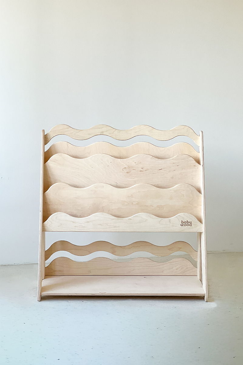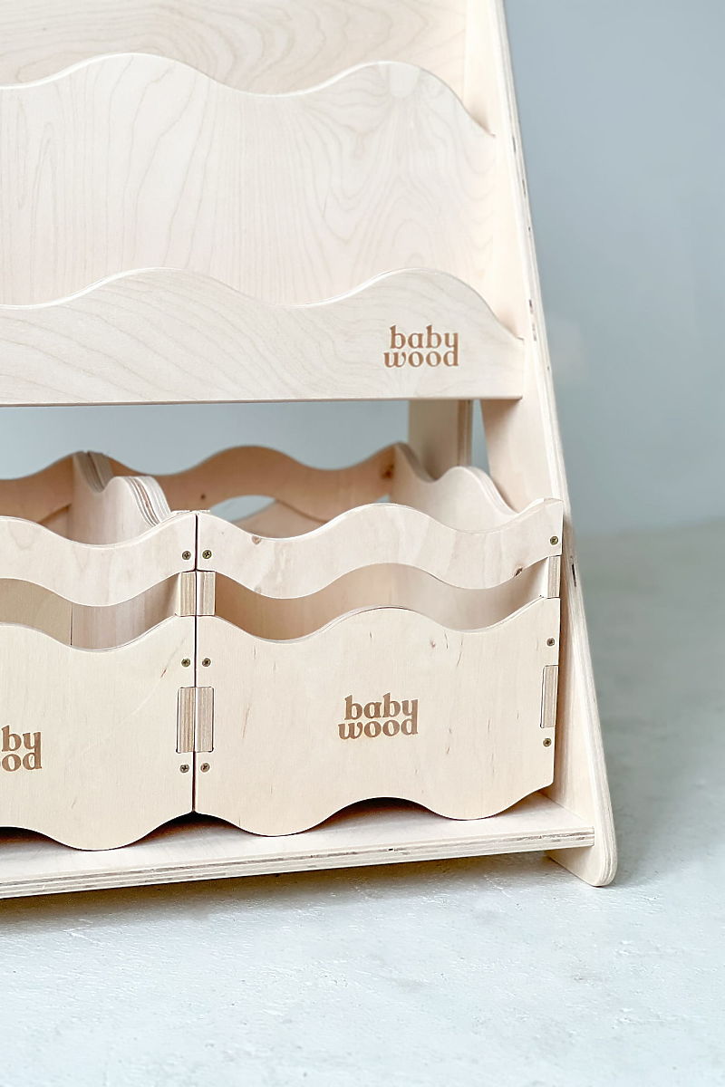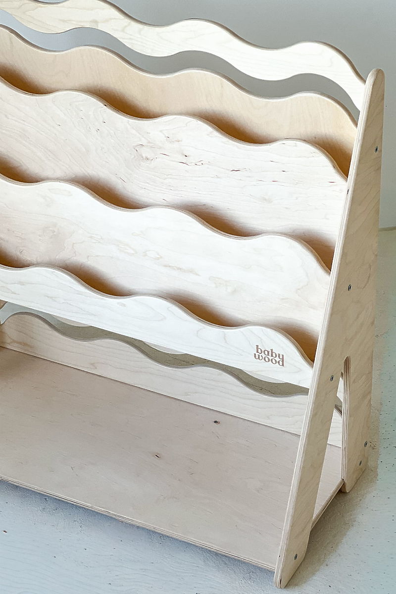Das Bücherregal und Spielzeugregal WAVE M in Naturfarbe kombiniert praktisch zwei Funktionen in einem Möbelstück – der obere Teil dient als Bücherregal für Kinderbücher, der untere Teil bietet Platz zur Aufbewahrung von Spielzeug. Eine ideale Lösung für das Kinderzimmer, wo Platz gespart und gleichzeitig Übersichtlichkeit bewahrt werden muss. Die wellenförmigen Frontleisten verleihen dem Regal ein sanftes, verspieltes Aussehen und sind gleichzeitig sicher für kleine Kinder. Dank der kinderfreundlichen Höhe kann das Kind leicht selbst Bücher und Spielzeug erreichen, was seine Selbstständigkeit und natürliche Entwicklung im Sinne der Montessori-Pädagogik fördert.