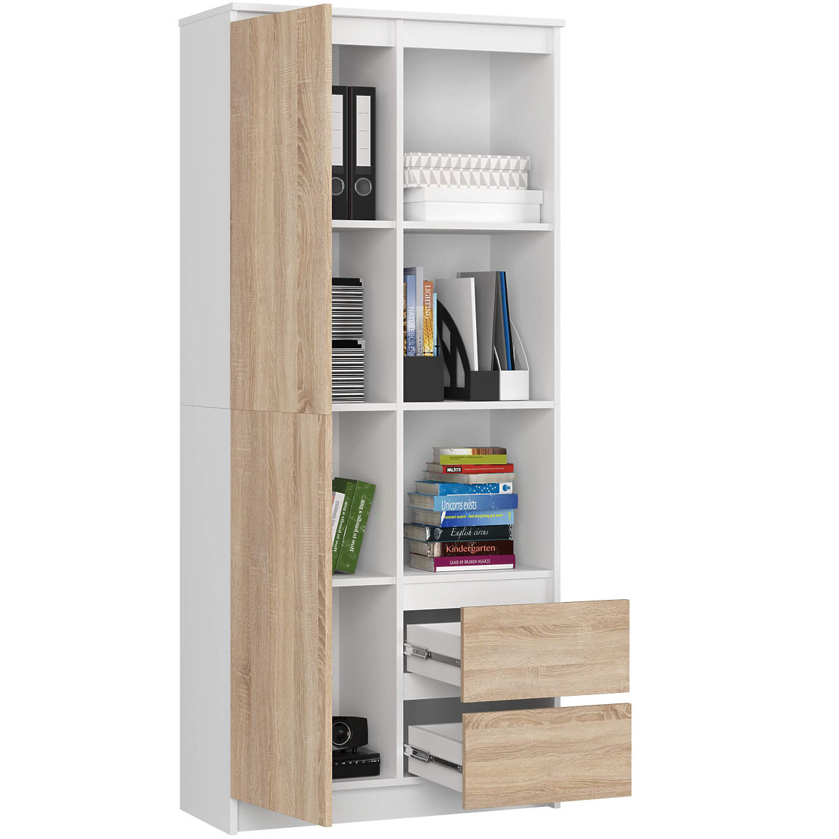 Büroregal mit Türen und Schubladen in einer Kombination aus Weiß und Sonoma-Farbe.