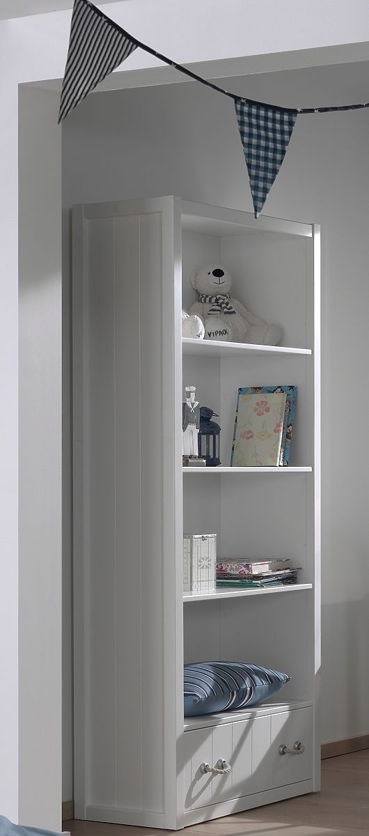 Der hohe, weiße Lewis Bücherregal mit 4 Regalen und 1 Schublade bietet Ihnen genug Platz für Bücher sowie Lieblingsartikel Ihrer Kleinen. Das weiße Design passt perfket zum Landhausstil. Die Vorderseite der Schublade sieht aus wie eine "Diele". Griffe aus starken Seilen sind stilvoll und originell.