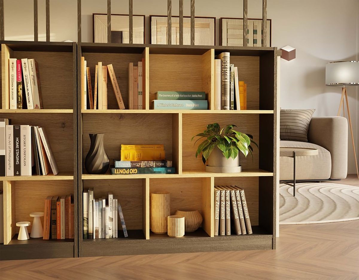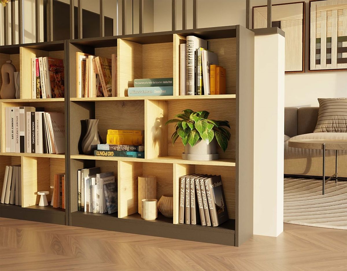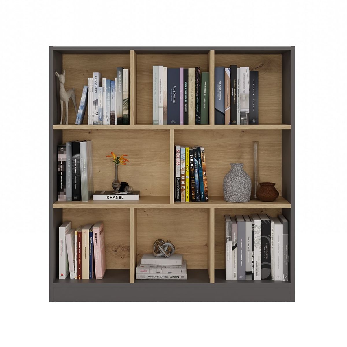 Dank der 8 geräumigen und proportional angeordneten Fächer ermöglicht das Regal FIESTA 8P eine ästhetische Aufbewahrung von Büchern, Dokumenten, Schmuckstücken oder Kisten. Die dekorative Kombination aus tiefem Anthrazit und warmem Eichenholz Artisan verleiht dem Interieur einen modernen und gleichzeitig gemütlichen Charakter.