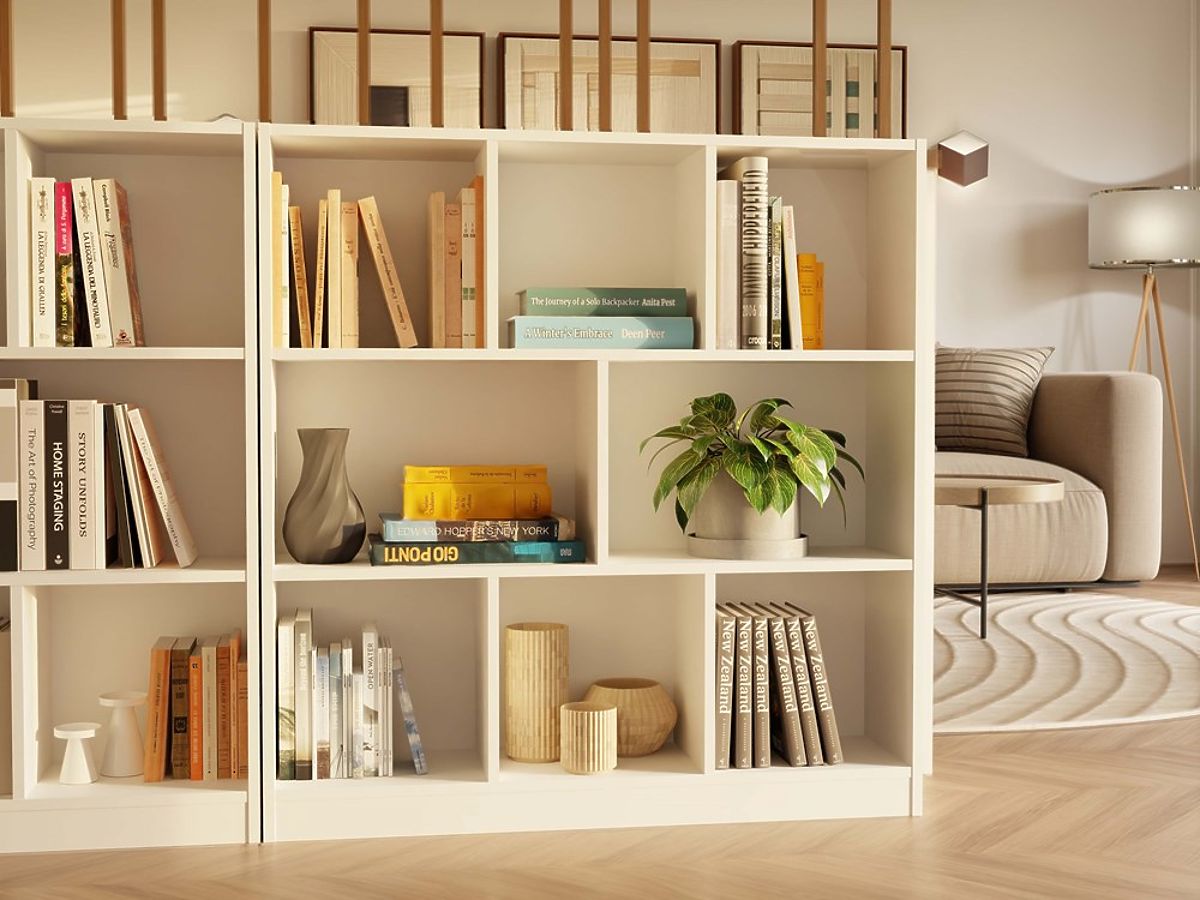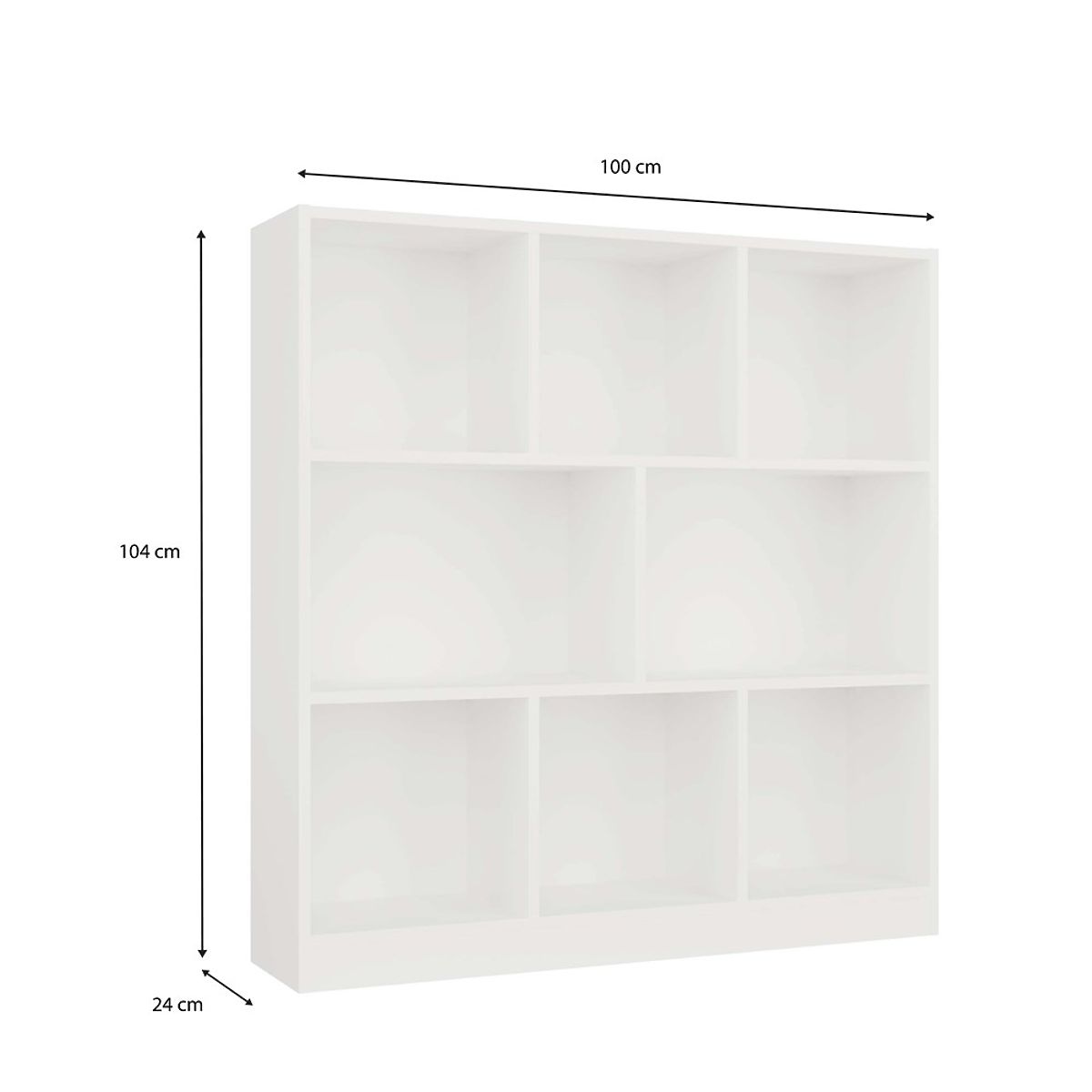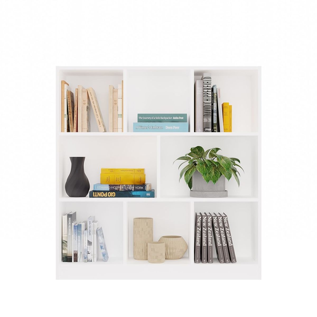 Es verfügt über 8 geräumige Fächer, die bei der Organisation des Raumes helfen und eine ästhetische Präsentation von Lieblingsgegenständen ermöglichen. Das klassische Weiß des Regals vergrößert optisch den Raum und verleiht ihm Leichtigkeit und Frische.