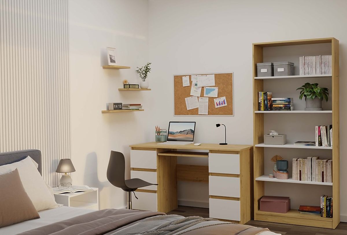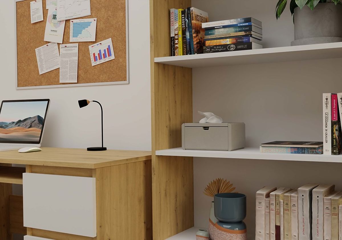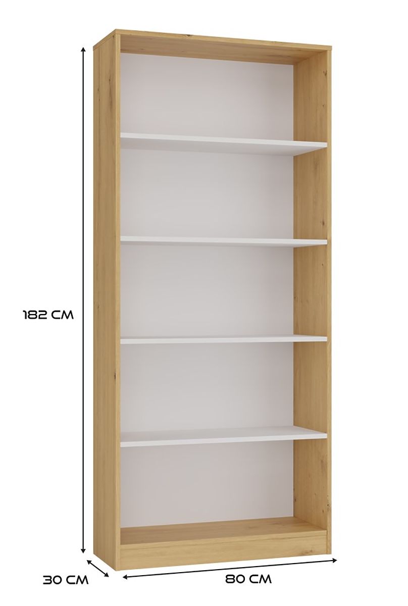 Das Regal R80 ist eine stilvolle und praktische Lösung zur Aufbewahrung von Büchern, Ordnern, Dekorationen und Büromaterialien. Die Kombination aus dem warmen Ton der Eiche Artisan und den kontrastierenden weißen Regalböden verleiht dem Möbelstück einen modernen und eleganten Charakter. Es passt hervorragend sowohl ins Büro, Wohnzimmer, Kinderzimmer als auch in die heimische Bibliothek.
