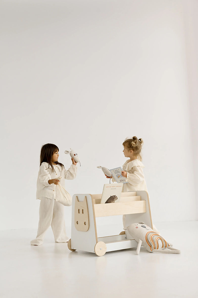 Holzspielzeugregal mit Rollen ist ein praktisches und funktionales Zubehör für das Kinderzimmer. Dank der vier Rollen lässt es sich mühelos bewegen, sogar von den Kindern selbst. Die beidseitige Ausführung ermöglicht einen bequemen Zugang zu Büchern und Spielzeug von beiden Seiten, was die Selbstständigkeit der Kinder beim Spielen und Aufräumen fördert. Das Regal bietet ausreichend Stauraum für Bücher, Spiele und Lieblingsspielzeuge und hilft, Ordnung im Kinderzimmer zu halten. Kinder lernen auf natürliche Weise, Dinge zu organisieren und an ihren Platz zu stellen.