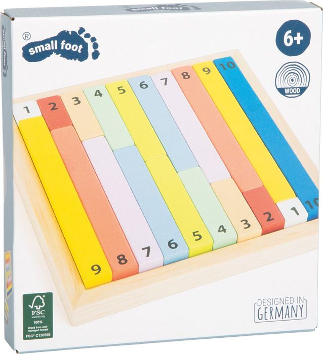 Das Puzzle enthält eine Holzbasis und bunte Würfel. Die Basis ist so gestaltet, dass immer Würfel hineinpassen, deren Summe 10 ergibt, z.B. Würfel 1 und 9, 7 und 3, 5 und 5 usw. Da jeder Würfel mit einem höheren Wert größer ist als der vorherige, können sie auch hintereinander angeordnet werden, um die Unterschiede zwischen den Zahlen zu zeigen und dem Kind beizubringen, welche größer, welche kleiner ist usw. Für eine noch bessere Präsentation hat jeder Würfel eine andere Farbe, z.B. 1 - weiß, 4 - mint, 7 - violett...