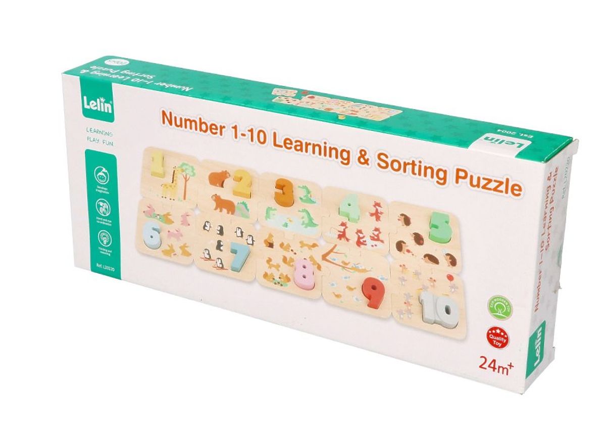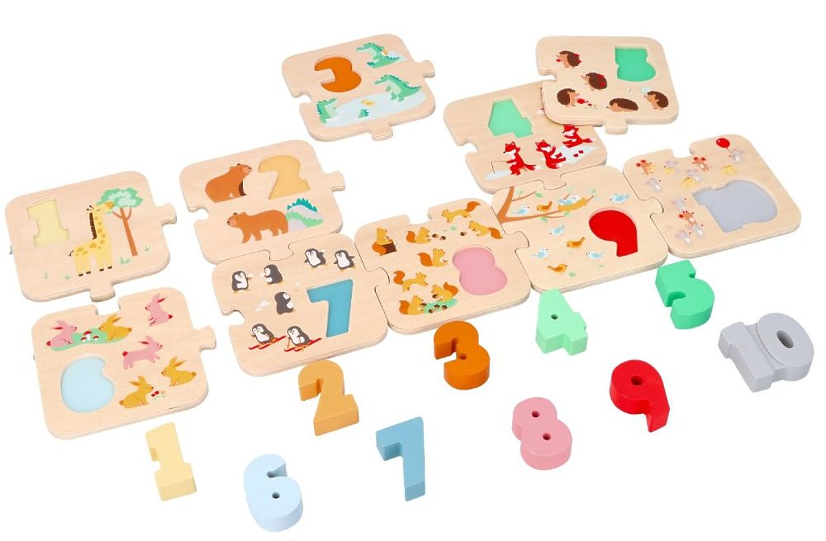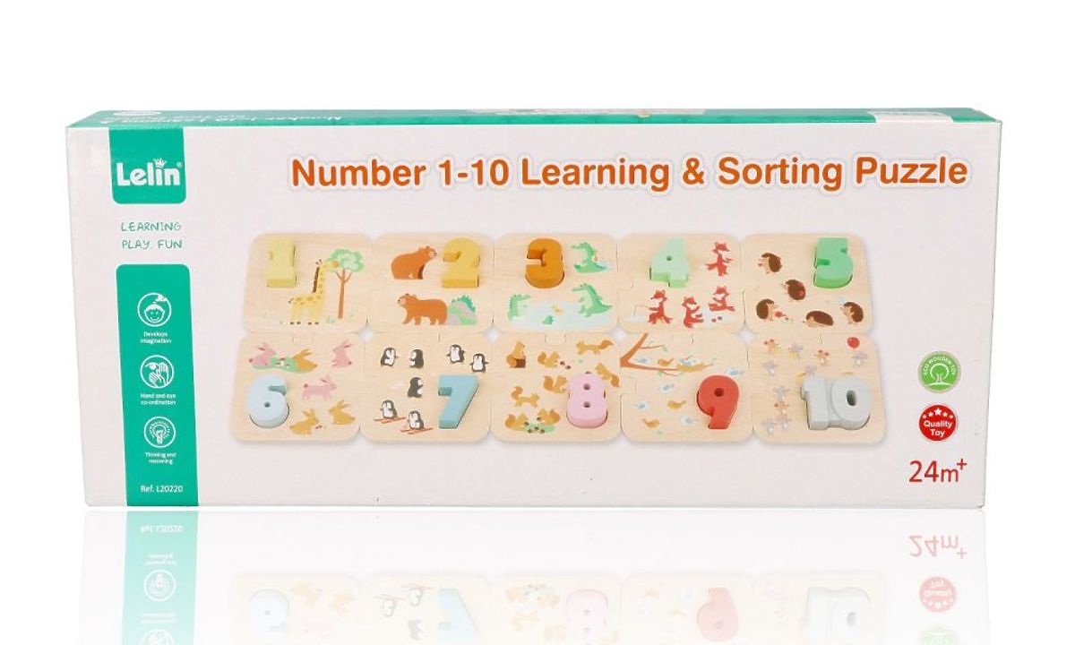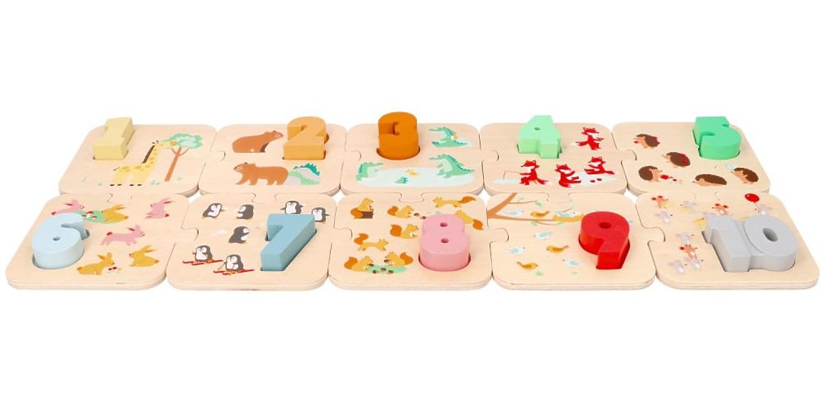 Dank dieser drei Spielmöglichkeiten entwickelt das Kind motorische Fähigkeiten und die Hand-Auge-Koordination durch das Zuordnen von Elementen. Das Erstellen einer Zahlenreihe hingegen fördert das Erkennen der Zahlen, das Kennenlernen ihres Aussehens und die Möglichkeit, einfache Aufgaben durchzuführen. Aber das ist noch nicht alles. Auf jedem Element finden Sie zudem sympathische Tiere, deren Anzahl der Zahl entspricht, z.B. 4 sind vier sympathische Füchse und 1 ist eine Giraffe usw.