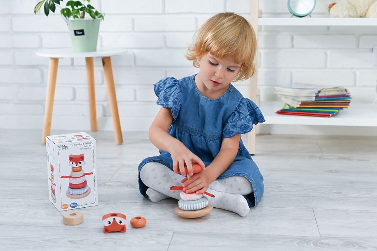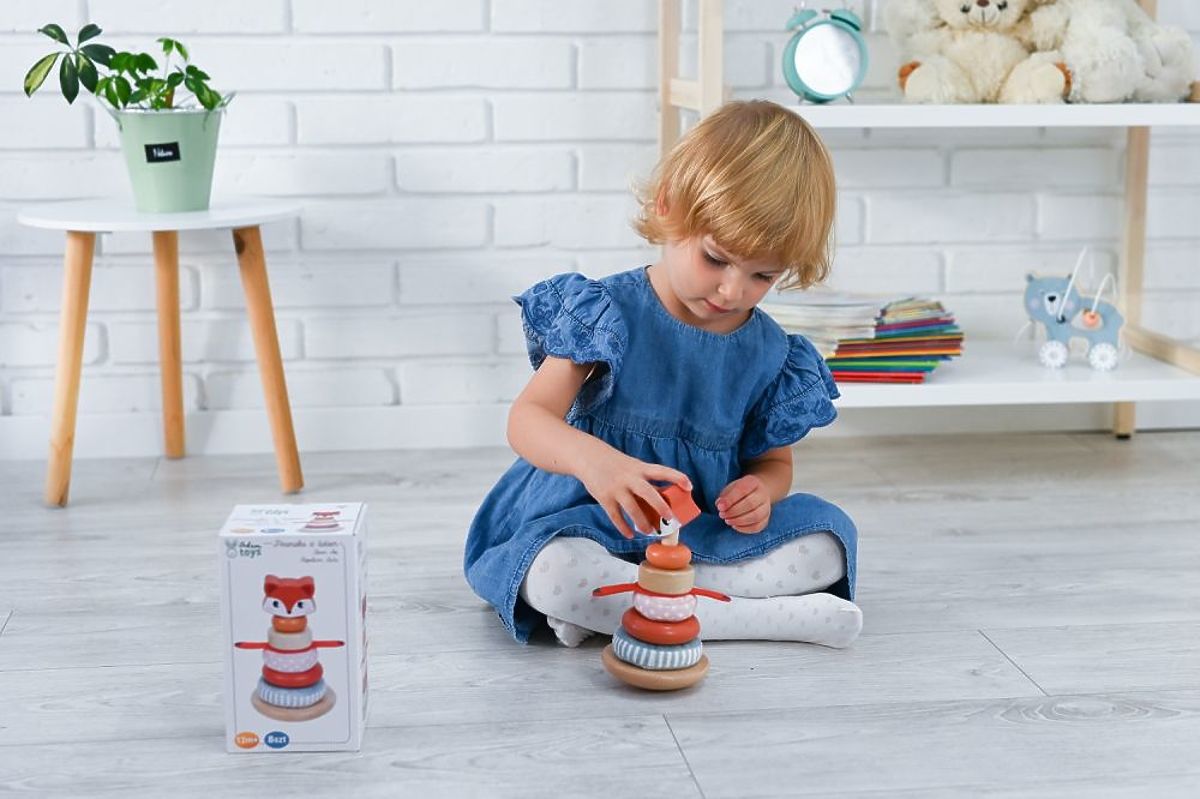 Das Spielzeug fördert hervorragend die Hand-Auge-Koordination und verbessert die Motorik kleiner Kinderhände. Zuerst lernt das Kind, den Ring auf den Stab zu treffen, was gar nicht so einfach ist. Dann unterscheidet es die Ringe nach Größe und passt sie so an, dass sie die richtige Form der Pyramide bilden. Darüber hinaus sind die Ringe aus Holz, weichen und angenehmen Materialien (rosa und blau) und Filz (Fuchspfoten) gefertigt. Durch die Verwendung verschiedener Materialien entwickelt das Kind das sensorische Wahrnehmungsvermögen der Hände. Verschiedene Texturen und taktile Empfindungen sind ein wichtiges Erkennungsmerkmal.