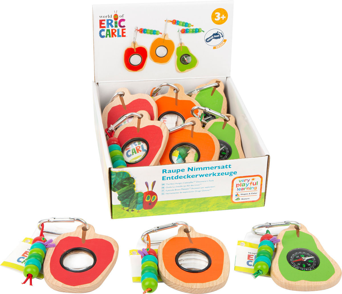 Werden Sie Forscher und entdecken Sie die Welt mit einem dieser Entdeckerwerkzeuge Caterpillar mit dem Motiv der hungrigen Raupe. Der Kompass zeigt an, in welche Richtung sich die jungen Forscher bewegen, während sie alles mit der Lupe beobachten. Dank des praktischen Karabiners kann es am Gürteletui oder Rucksack befestigt werden, sodass auf der Entdeckungsreise nichts verloren geht. Das niedliche Holzspielzeug ist ein absolutes Muss für jeden kleinen Entdecker und Pfadfinder. Hauptmerkmale: mit fröhlichem Motiv der hungrigen Raupe kann am Gürteletui oder Rucksack befestigt werden robustes Design