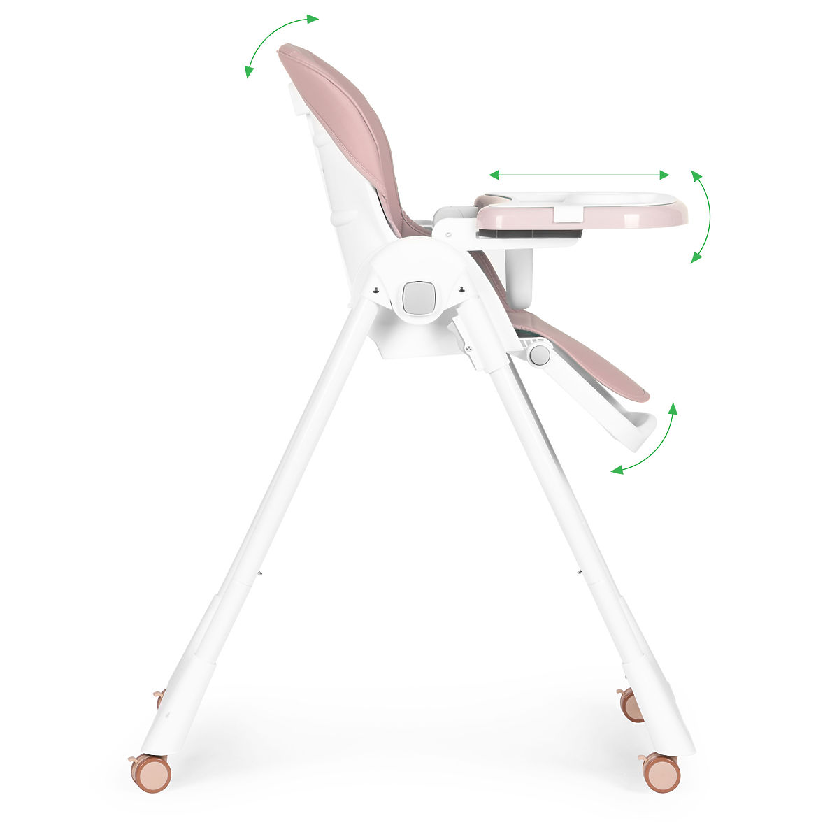 VOLLE VERSTELLBARKEITDie durchdachte Konstruktion des Hochstuhls ermöglicht die Anpassung der wichtigsten Elemente, die den Komfort und die richtige Position des Kindes beeinflussen. Dank dieser Funktionalität passen Sie die gesamte Konstruktion ideal an die Größe und das Alter des Kindes an, der Komfort und die Bequemlichkeit, die dieses Modell bietet, sorgen dafür, dass Ihr Kind seinen Hochstuhl schnell lieben wird und ihn gerne benutzt. Sie können die Neigung der Rückenlehne von aufrecht bis liegend einstellen, was ideal für die kleinsten Kinder ist. Unter dem Sitz befindet sich eine funktionale Fußstütze, deren Position Sie ebenfalls an die Größe des Kindes anpassen können, sodass es seine Füße bequem abstützen kann, was positiv auf Komfort und Sicherheitsgefühl wirkt. Das Tablett, das bei Bedarf entfernt werden kann, verfügt ebenfalls über eine Einstellung der Entfernung und Neigung, wodurch Sie den Hochstuhl problemlos durch Reduzierung seiner Abmessungen verstauen können.