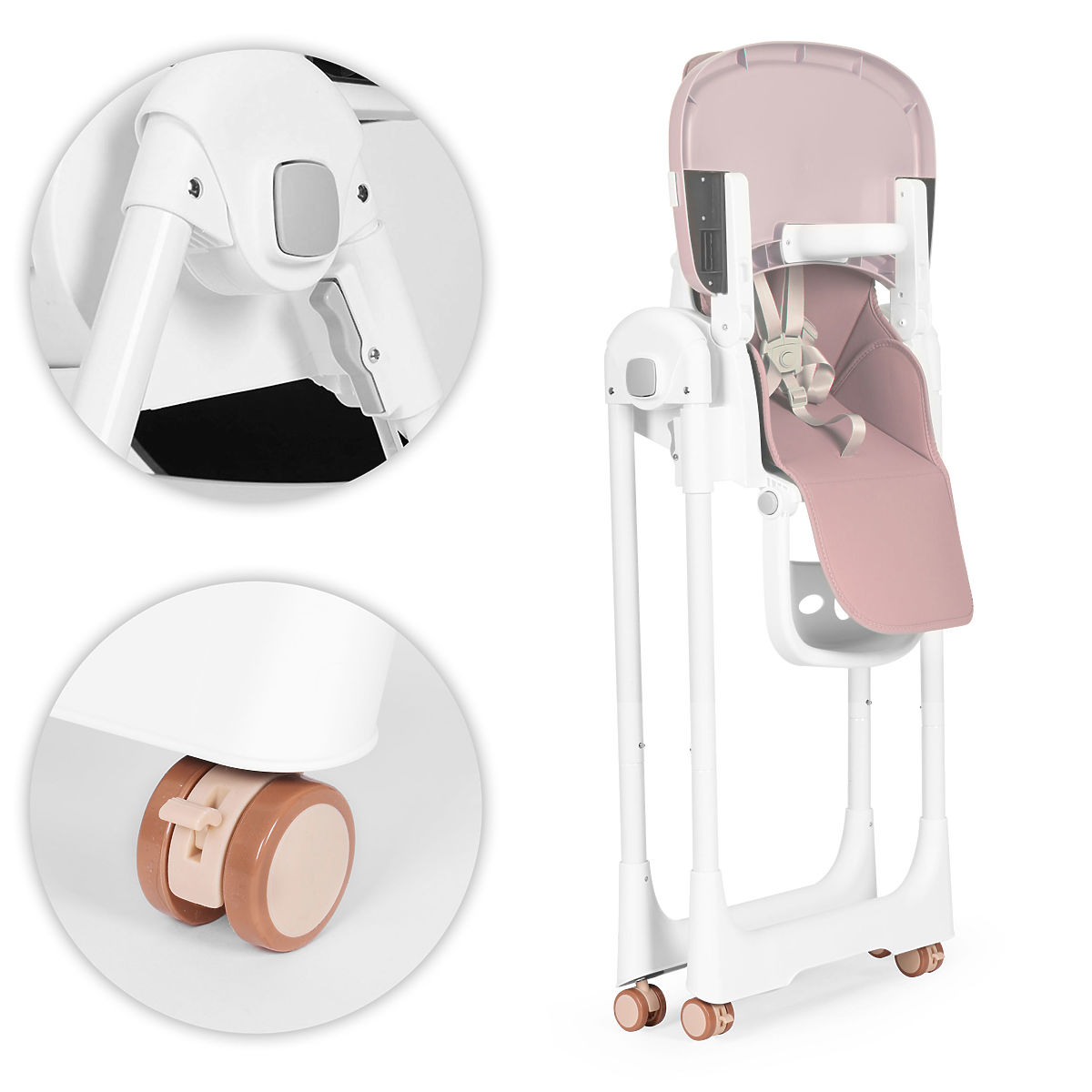 SICHERE RÄDERDie Beine des Hochstuhls sind mit Rädern versehen, die ein blockierendes Element für ihre Drehung haben, mit einer Bewegung können Sie sie blockieren und die gesamte Konstruktion effektiv immobilisieren. Die Räder erleichtern das Verschieben des Hochstuhls an den gewünschten Ort und ihre Gummilauffläche schützt den Boden vor Kratzern.