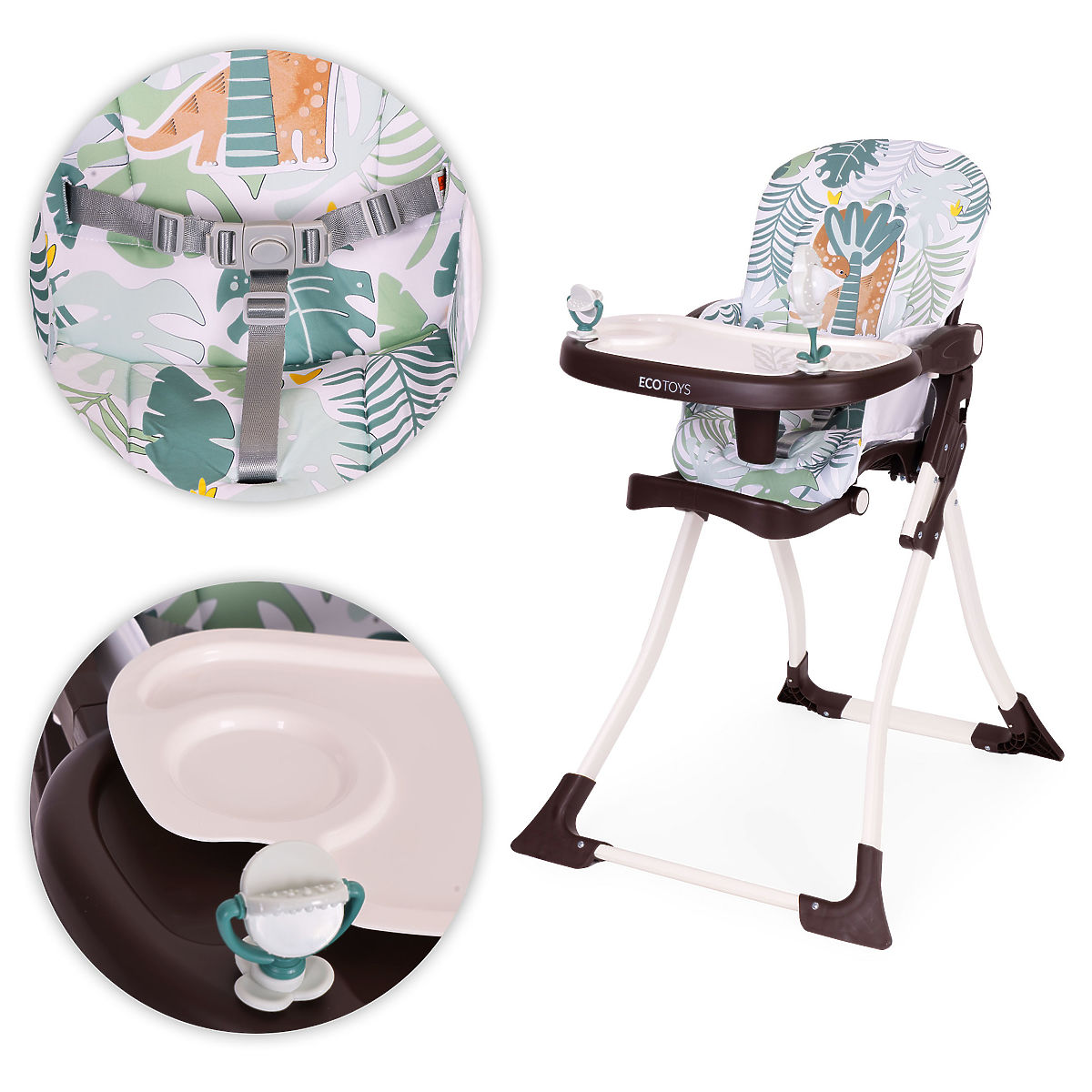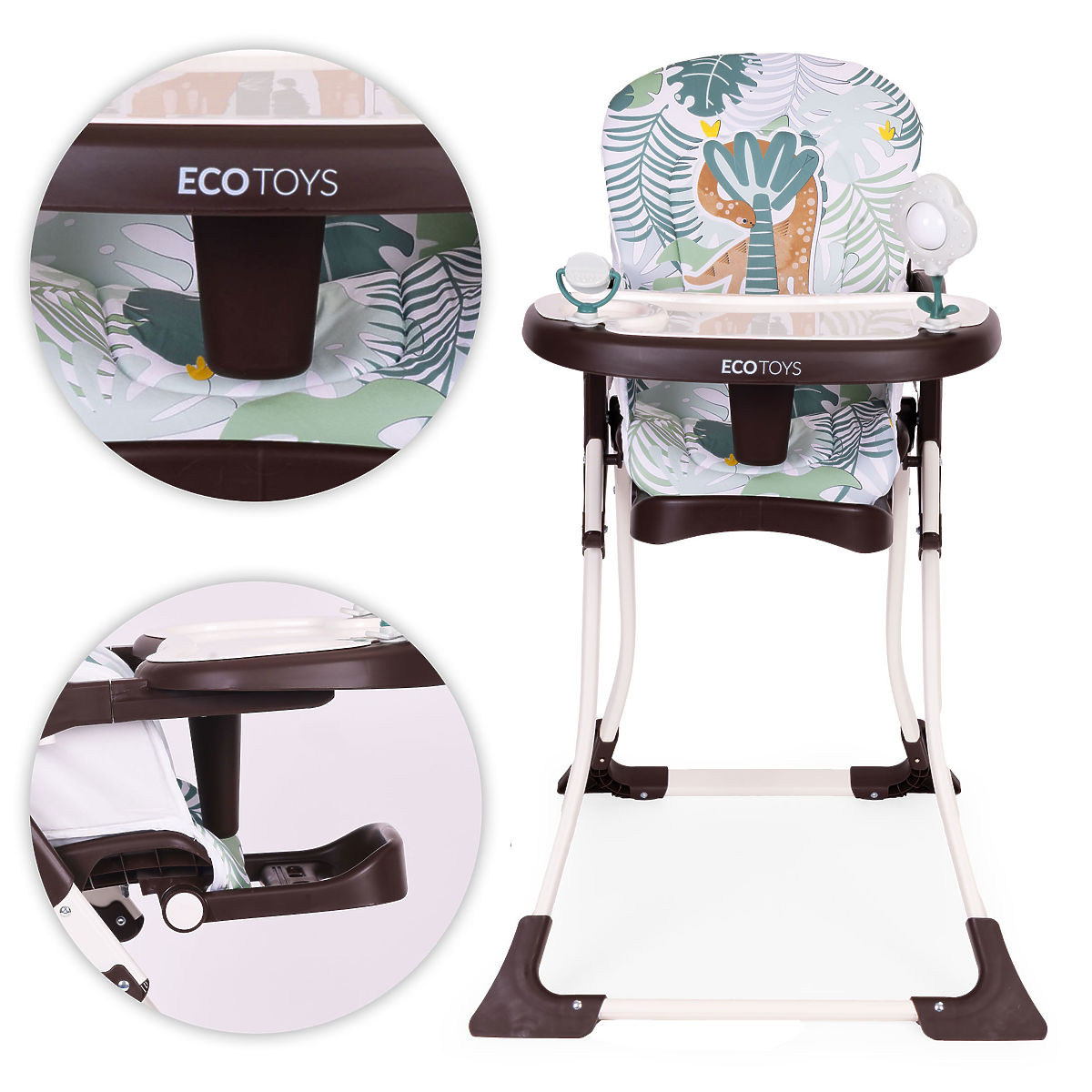 FUNKTIONALITÄT IN JEDEM DETAILZweischichtiges, verstellbares Tablett ist eine praktische Lösung, die die Reinigung erleichtert und den Hochstuhl an das Kind anpasst. Die obere Schicht kann leicht abgenommen und gereinigt werden, und die Verstellmöglichkeit ermöglicht es, den Abstand des Tabletts an das Alter und die Bedürfnisse des Kindes anzupassen.