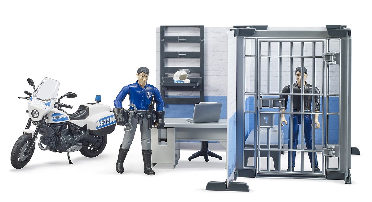 Für die breite Palette der BRUDER Polizeifahrzeuge gibt es jetzt die neue BWORLD Polizeistation als Koordinationszentrum. Im Bürobereich kann der Polizist jede Mission mit modernster Ausrüstung koordinieren und überwachen. Wird ein Verdächtiger gefasst, kann er in der Zelle festgehalten werden. Das Scrambler Ducati Polizeimotorrad vor der Polizeistation ist bereit für den Einsatz. Die Station lässt sich leicht mit anderen BWORLD Sets kombinieren. Es gibt Zubehör in Form von Polizeifahrzeugen. Hergestellt in Deutschland aus hochwertigen Materialien. Hauptmerkmale: Polizistenfigur mit Ausrüstung und Motorrad, festgenommene Figur, 2 beidseitig bedruckte Wände der Station, 2 Gitterteile inklusive Türen, Regalteil, Stuhl, Tisch, Bett und Laptop, hergestellt in Deutschland.
