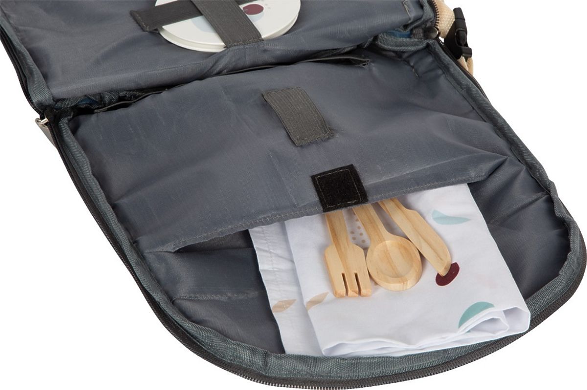 Verwandeln Sie jedes Picknick in ein unvergessliches Erlebnis mit dem Picknickrucksack! Dieser praktische Rucksack enthält alles, was Sie für ein bequemes Essen im Freien benötigen: einen Holzteller, einen Becher und Besteck für zwei Personen. Außerdem finden Sie darin eine Thermoskanne, ein Klappmesser und eine Picknickdecke. Die geräumige Innentasche mit Reißverschluss ermöglicht die sichere Aufbewahrung des gesamten Zubehörs dank elastischer Bänder und Klettverschluss. Verstellbare Schultergurte bieten optimalen Tragekomfort und ermöglichen die richtige Anpassung des Rucksacks an das Kind. Das moderne Design, das neutrale weiße Farbe, natürliches Holz und beliebte Trendfarben kombiniert, fügt sich harmonisch in jedes Kinderzimmer ein und passt hervorragend zu weiteren Produkten aus der „Tasty“-Reihe. Dieser Rucksack ist der ideale Begleiter für unvergessliche Picknickmomente, kreatives Spielen und Ausflüge in die Natur! Das Set enthält: 1 Rucksack, 1 Thermoskanne, 1 Picknickdecke, 2 Löffel, 2 Messer, 2 Gabeln, 2 Becher, 2 Teller, 1 Taschenmesser. Hauptmerkmale: moderner Picknickrucksack mit viel Zubehör für zwei Personenunterstützt die Entwicklung der Feinmotorik, sozialen Fähigkeiten und AlltagskompetenzenReißverschluss und separate Innentasche für einfache Lagerungelastische Bänder halten das Zubehör sicherverstellbare Schultergurte für hohen Tragekomfortmodernes Design in Kombination mit Weiß, natürlichem Holz und Trendfarbenverpackt in einer Boxkompatibel mit weiteren Produkten aus der „Tasty“-Reihe