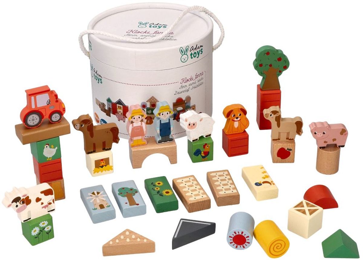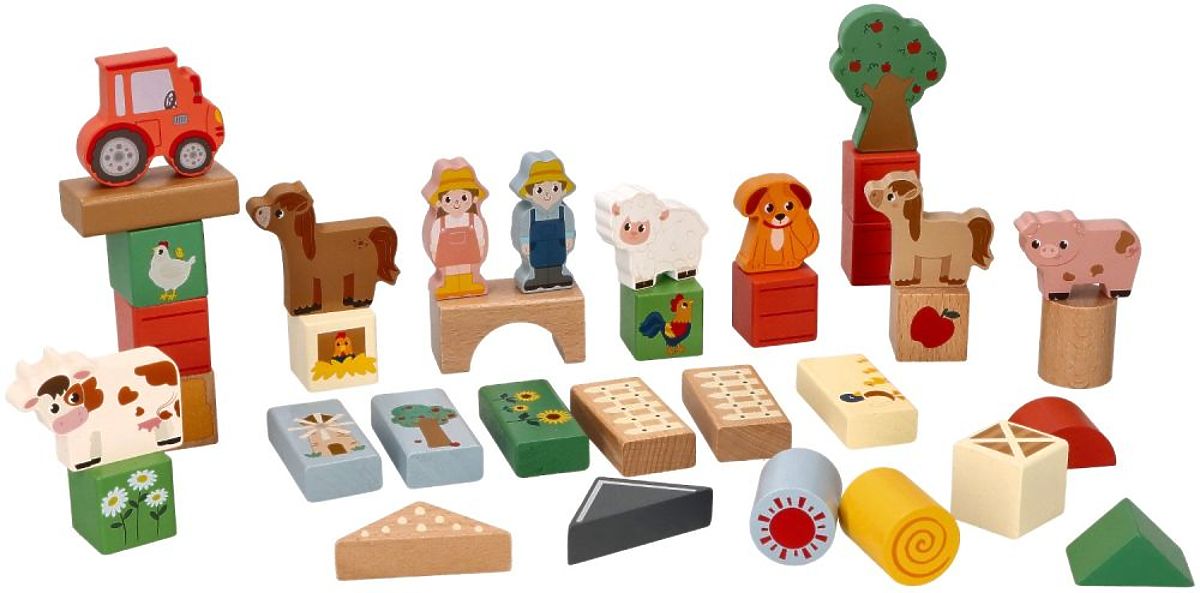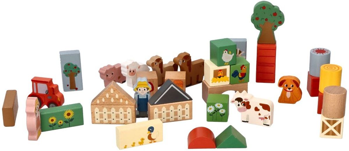Bauen Sie Ihren eigenen Bauernhof! Der kleine Bauer sollte die Ärmel hochkrempeln, denn es wartet viel Arbeit auf ihn :) Die Tiere können es kaum erwarten, die Ställe und Gehege zu beziehen, die der kleine Baumeister mit diesen bunten Bausteinen errichten wird. Das große Set mit 36 Holzbausteinen in verschiedenen Formen und Größen bietet vielfältige Konstruktionsmöglichkeiten. Die Bausteine sind mit Bauernhofmotiven verziert, was ein einheitliches Ganzes schafft und Kinder in die Welt der ländlichen Tiere einführt. Durch das Spiel entwickelt das Kind die Hand-Auge-Koordination und erweitert beim Erzählen über das, was es sieht, seinen Wortschatz.