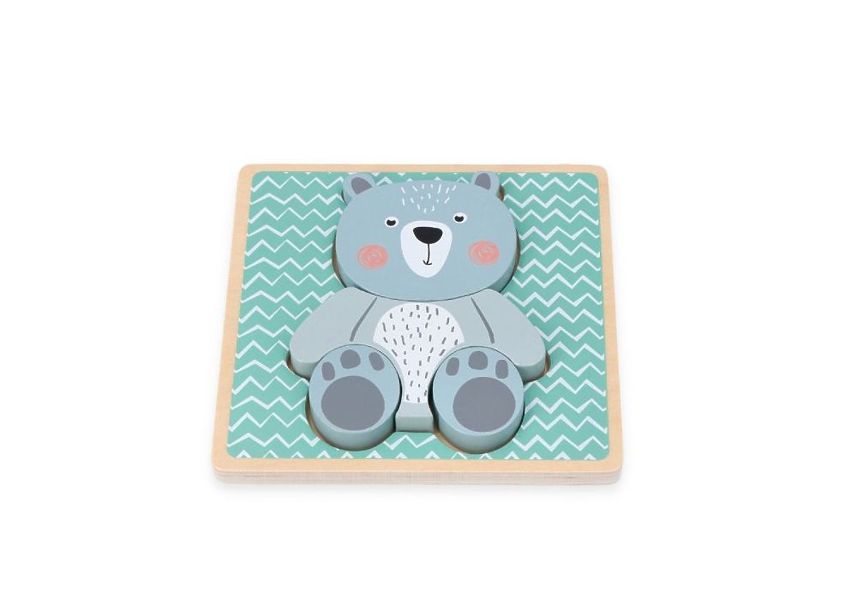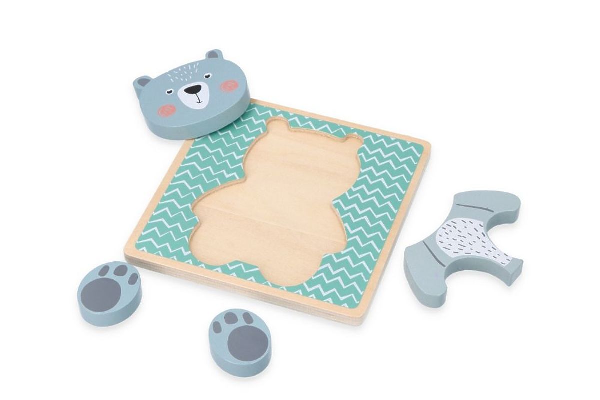 Das Puzzle besteht aus einer Basis und vier Blöcken zum Zusammenbau des Bärchens. Das Kind muss nicht nur Ríša als Ganzes zusammensetzen, sondern auch die Blöcke an die Basis anpassen. Die Blöcke können auch außerhalb der Basis gestapelt werden.