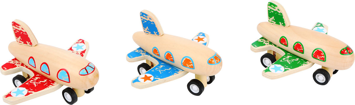 Bereit zum Abflug! Flugzeuge mit Aufziehmotor aus einer Kombination von naturbelassenem und farbigem Holz. Spielzeuge mit Aufziehmotor sind sehr beliebt, man zieht sie einfach nach hinten, lässt sie los und beobachtet dann, mit welcher Geschwindigkeit sie nach vorne rasen. Flugzeug mit blauen, roten oder grünen Flügeln. Hauptmerkmale: Aufziehmechanismus, drei Farbvarianten, robust und langlebig