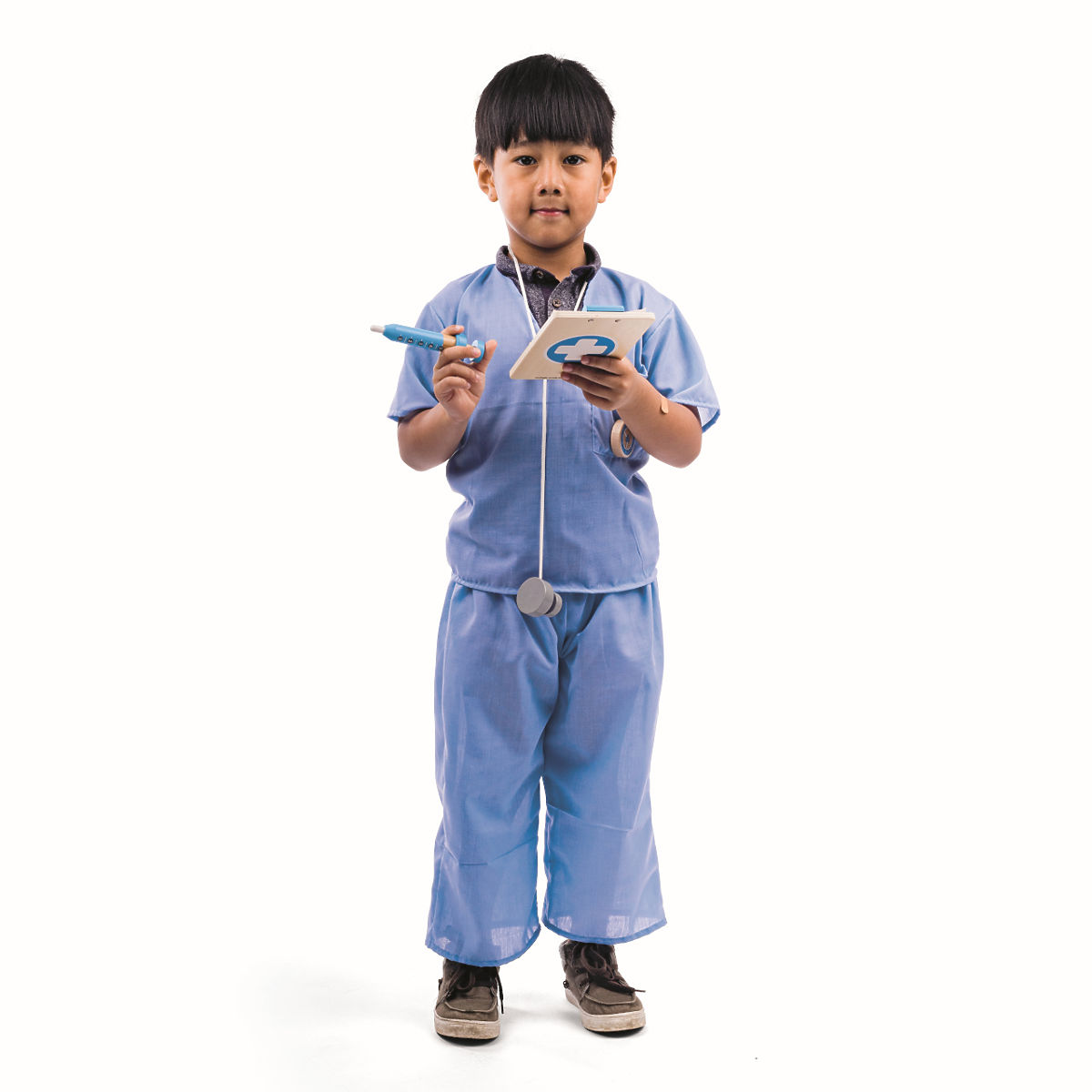 Helfen Sie Kindern, Teddybären, Puppen oder Familienmitglieder mit diesem realistisch aussehenden Kinder-Arztkostüm zu versorgen. Dieses Arztkostüm umfasst ein blaues Hemd, Hosen, ein Holzstethoskop, Arztunterlagen, in denen Kinder diagnostische Notizen aufschreiben können, ein Thermometer, eine Taschenuhr, eine Spritze und auch Pflaster. Klettverschlüsse ermöglichen ein einfaches An- und Ausziehen des Kostüms. Das Kostüm besteht aus Baumwolle und Polyester und ist maschinenwaschbar. Hauptmerkmale: ideal zur Versorgung kranker Teddybären oder Puppen, fördert die Entwicklung von Fantasie, Sprache und sozialen Fähigkeiten, hilft, Ängste und Sorgen vor Arztbesuchen zu lindern.