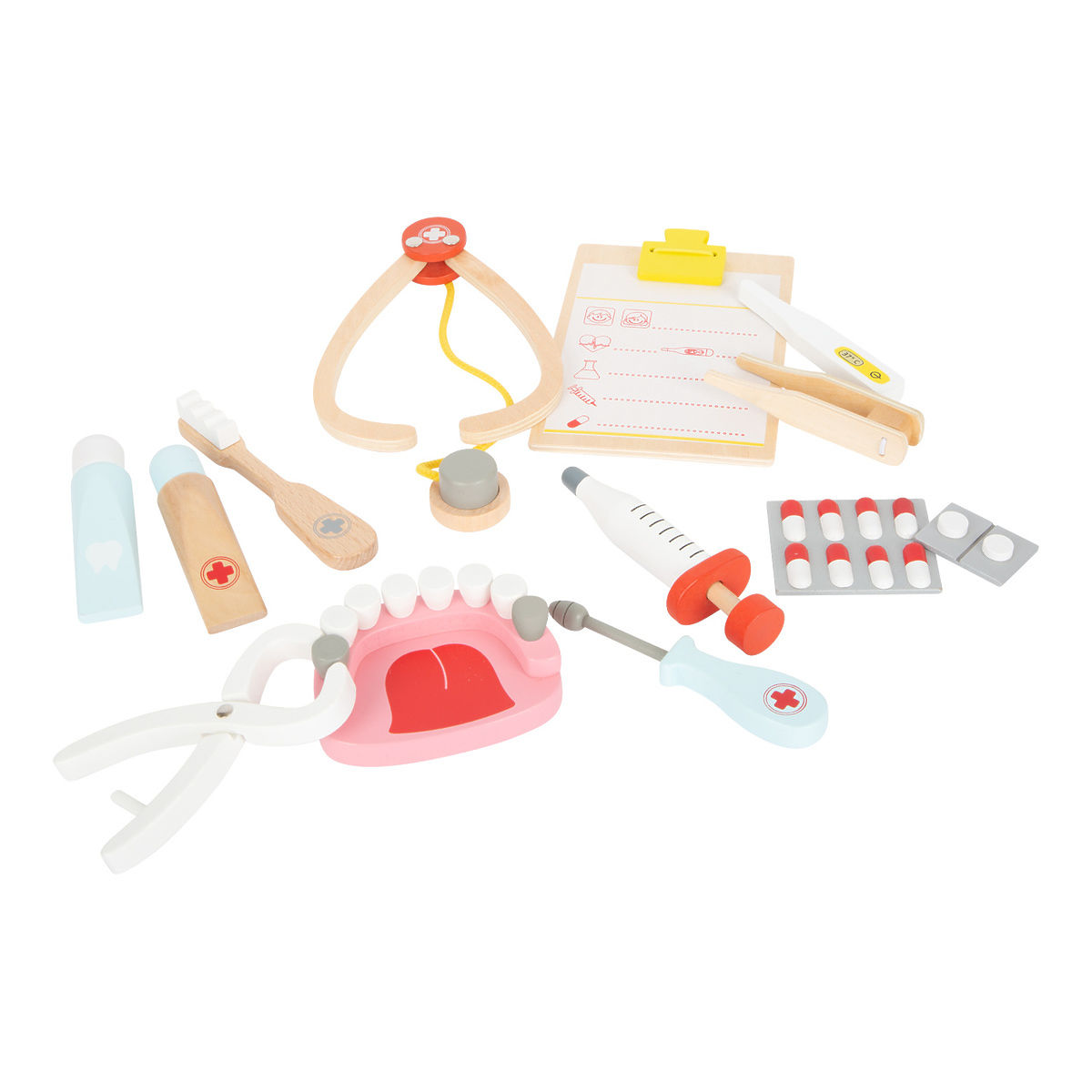 Karies hat keine Chance! Der Koffer mit Schloss wird durch seine Holzaccessoires mit schönem Design Eindruck machen. Kinderspritze, Bohrer, Zahnbürste, Gebiss, Zahnpasta und Pinzette, dieses hölzerne Kinderzahnarztset hat alles! Zwei graue Zähne zeigen Kindern, wie wichtig Zahnhygiene ist. Mit Thermometer, Balsam, Pinzette, Pillen und einem Notizblock ist der Koffer auch für das Arztspiel geeignet. Das perfekte Spielzeug, um Kinder auf den ersten Besuch beim Zahnarzt oder Arzt vorzubereiten. Kinder können Arzt spielen, dieses Spiel fördert die Kreativität und macht Kindern Mut. Sämtliches Zubehör passt bequem in den Koffer. Eröffnen Sie Ihre eigene Praxis! Hauptmerkmale: Holzetui mit Schloss. Thermometer, Balsam, Spritze, Pinzette, Tabletten, Zahnmodell. Schönes Kinderdesign