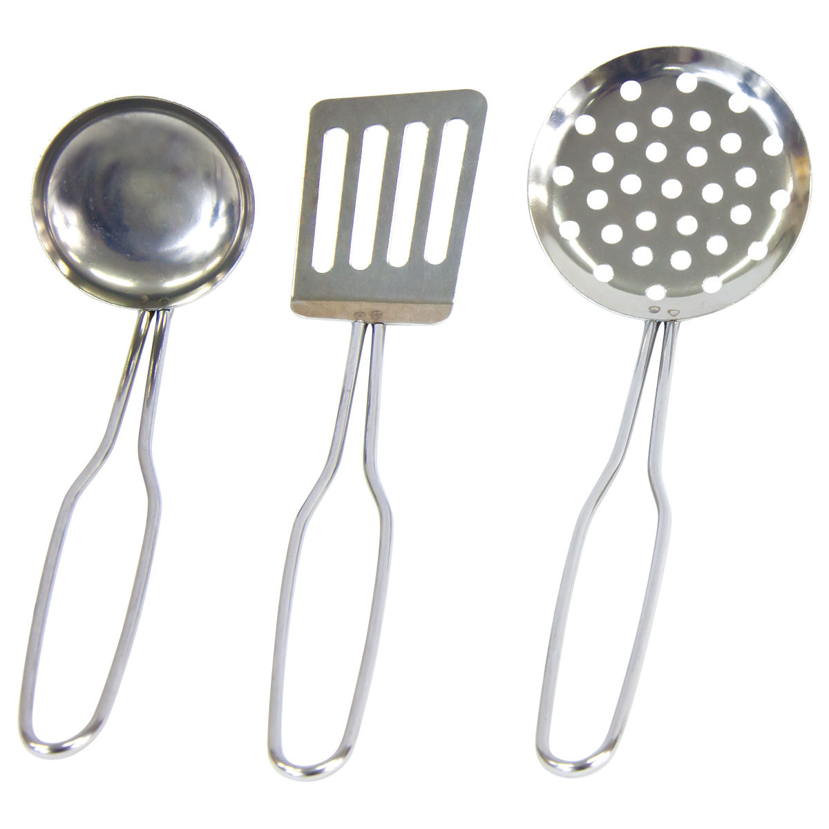 Ein Set aus Küchenutensilien und -geschirr für Mädchen, um Hausfrau zu spielen. Es enthält Töpfe mit Deckeln, eine Pfanne, kleines Küchenzubehör und einen Topflappen. Geeignet für Spiele drinnen und draußen. Hauptmerkmale: 3 Töpfe mit Deckeln, Pfanne, Schöpflöffel, Sieb, Wender und Topflappen