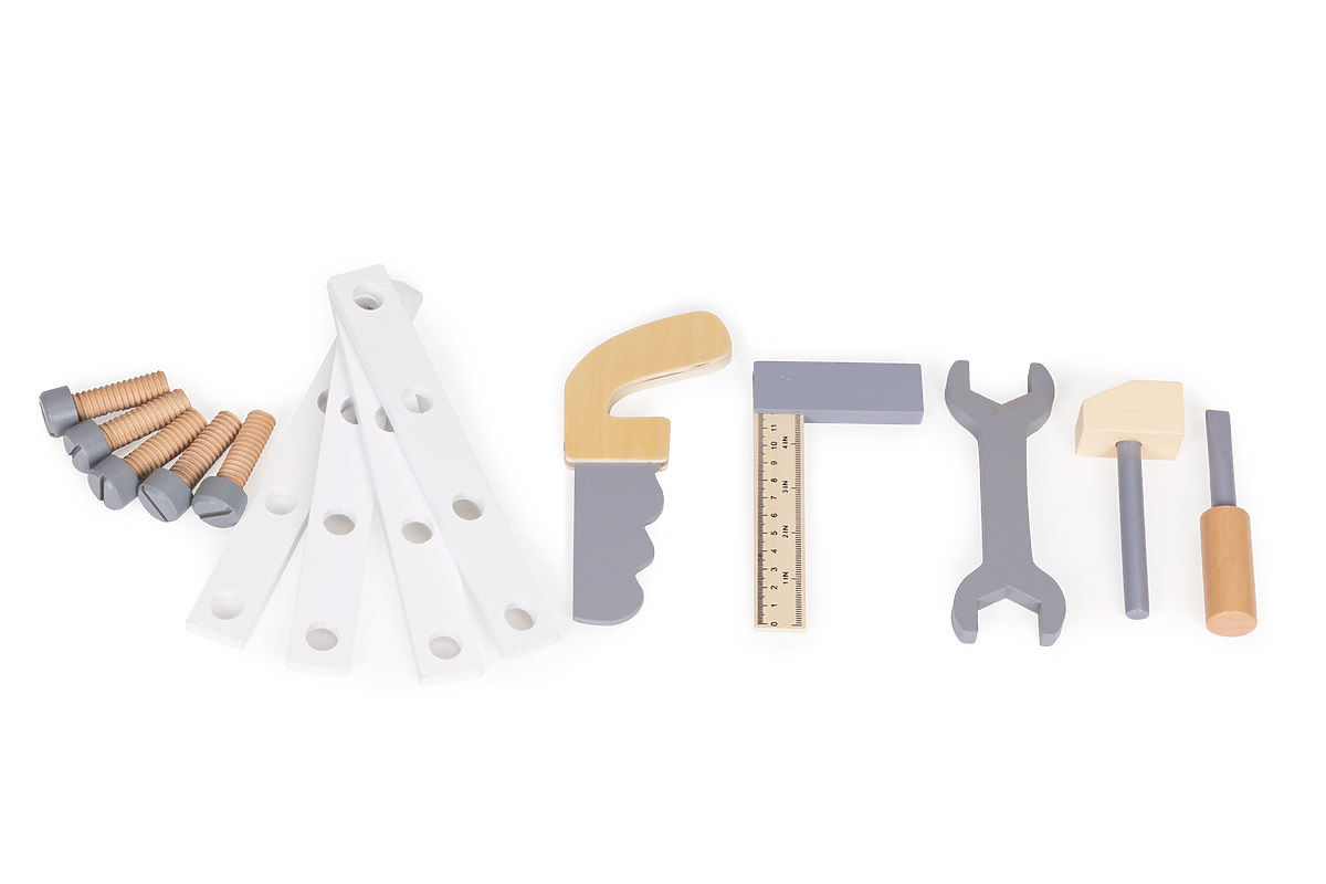 Alle Werkzeuge und Zubehörteile sind aus Holz, mit sicheren Farben bedeckt und ohne scharfe, gefährliche Kanten.