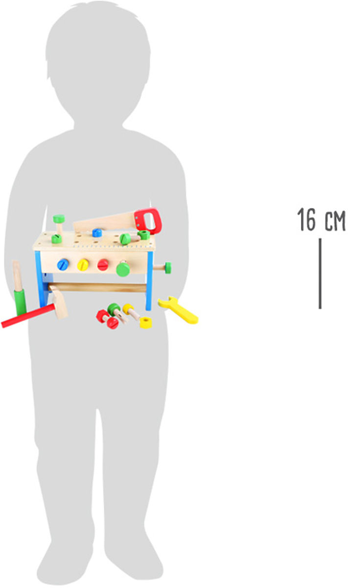 Hier können Sie sägen, hämmern und schrauben. Diese bunte Werkbank verwandelt sich im Handumdrehen in einen Werkzeugkasten, sodass Sie alle Werkzeuge aus hellem Holz schnell verstauen können. Schraubendreher, Schlüssel, Hammer, Säge, Schrauben und Muttern können im Kasten verstaut und dank des praktischen Griffs überallhin mitgenommen werden. Was bauen wir als Nächstes und wohin nehmen wir es mit? Hauptmerkmale: Das Set enthält 30 Teile 2-in-1 – Werkbank und Werkzeugkasten trainiert die Feinmotorik
