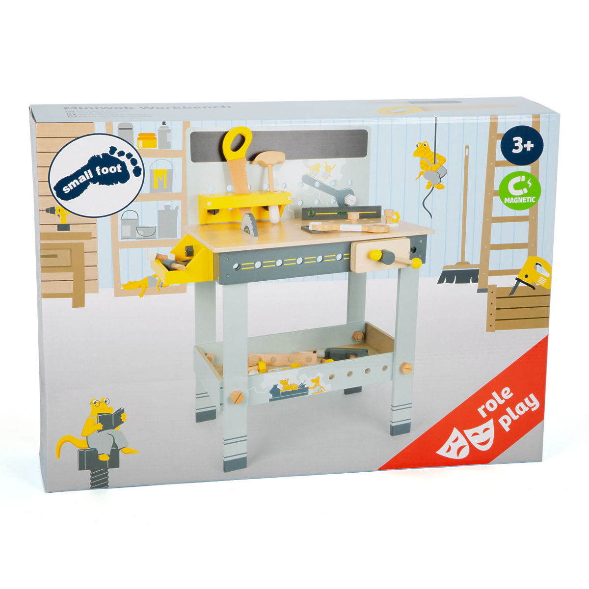 Sägen, Schrauben drehen, Hämmern! Gemeinsam mit den niedlichen Miniwobs können Kinder ihre Geschicklichkeit und Feinmotorik testen. Auf der Werkbank finden Sie Ausrüstung wie 1 Kreissäge, 1 elektrischen Schraubendreher mit 3 Aufsätzen, 1 Wasserwaage, 1 Schraubstock, 1 Hammer, 1 Schlüssel, 1 Säge, 2 Kisten mit Löchern für Schrauben, 6 Bauleisten, 16 Schrauben, 16 Muttern, 3 Nägel. Kinder können ihr Projekt auf der Tafel skizzieren und ihr Werkzeug in kleinen Boxen verstauen, die an der Seite der Werkbank aufgehängt werden können. Die Kinder können Ihnen sogar beim Zusammenbau der Werkbank helfen! Minimalistische Farben, viel sichtbares Holz, einfach das perfekte Spielzeug für kleine Handwerker und Handwerkerinnen. Hauptmerkmale: Aufbewahrungsboxen, die an der Seite der Werkbank angeschraubt werden können, Acht Holzwerkzeuge und verschiedene Zubehörteile, Tafel zum Skizzieren von Projekten, Kinder können beim Zusammenbau der Werkbank helfen, Schöne Kinderillustrationen von Miniwob. Miniwob: Lernen Sie die kleinen Wobs kennen, begeisterte Krokodil-Handwerker! Mit ihrer Hilfe geht jede Arbeit leicht von der Hand und kein Bauvorhaben ist zu groß oder zu durchdacht. Die vielfältige Auswahl an Werkzeugen und Geräten bietet perfekten Spaß für alle kleinen Handwerker, durch die sie kreativ sein und all ihre fantastischen Ideen umsetzen können. Die einzelnen Sets können miteinander kombiniert und mit den wachsenden Fähigkeiten der Kinder erweitert werden. Dank des einheitlichen Farbmotivs und der Darstellung der niedlichen Wobs kann eine einzigartige und vollständige Werkstattecke geschaffen werden, die gleichzeitig ein wertvolles Konstruktionsspielzeug zur Förderung von Geschicklichkeit und Vorstellungskraft ist.