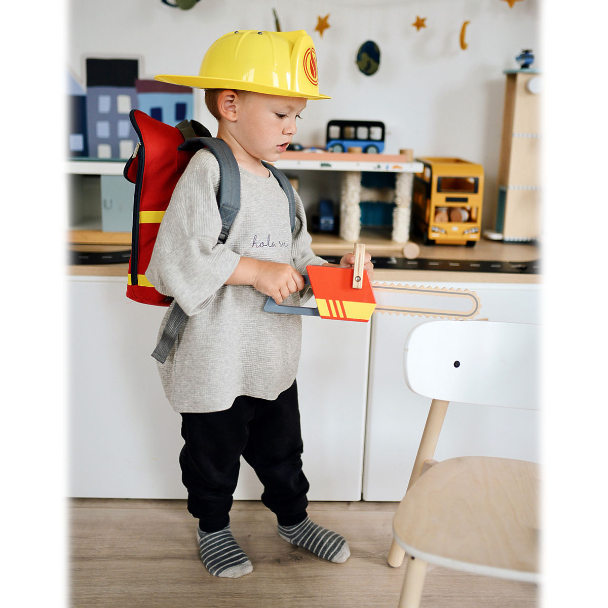 Robuste Motorsäge aus Holz mit Feuerwehrthema für Kinder. .. mehr
