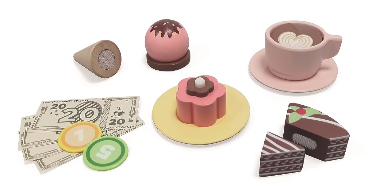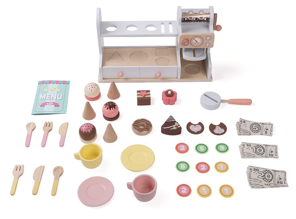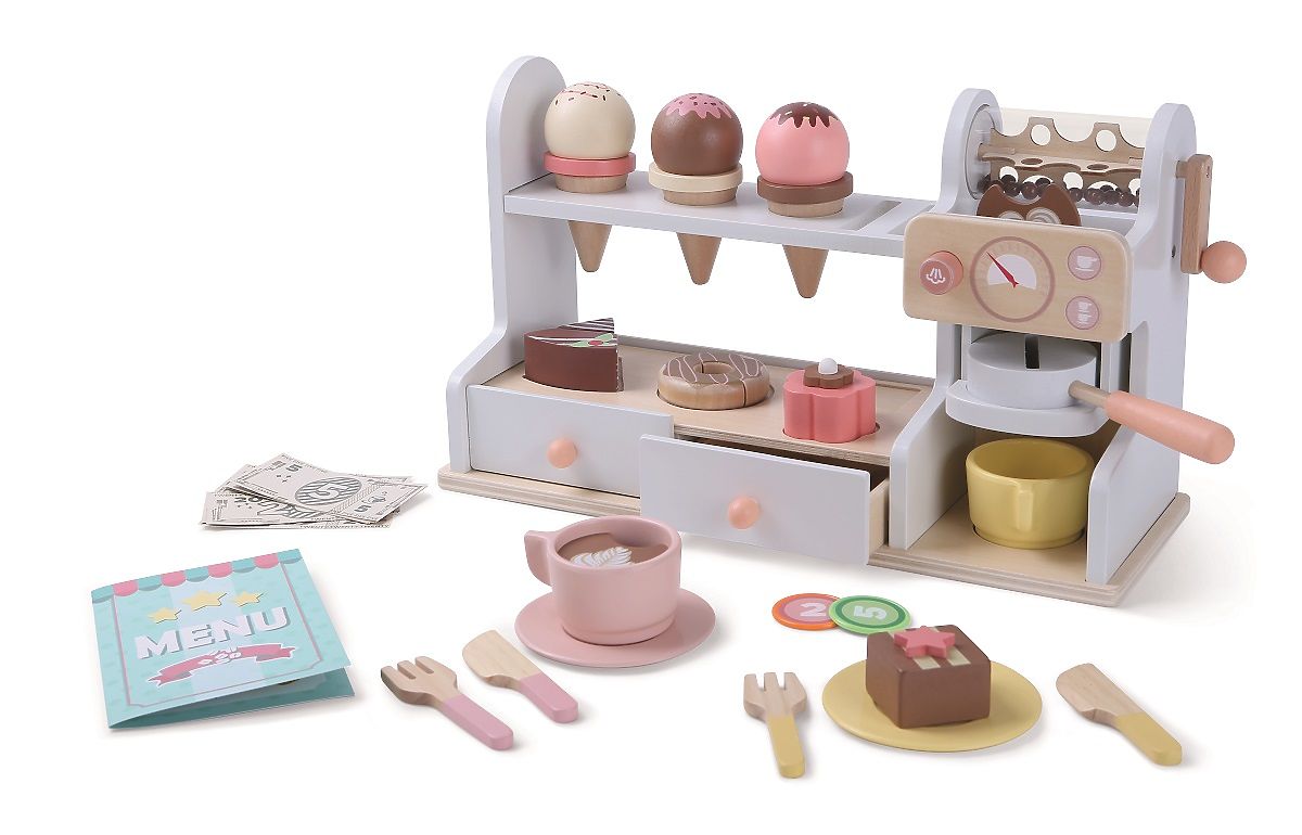 Werde ein echter Barista oder Händler! Möchten Sie ein Eis, ein Törtchen oder nur einen köstlichen Kaffee? Mit diesem 46-teiligen Set genießen Sie stundenlangen Spaß. Das Set bietet Tassen mit Untertassen, Besteck und Löffel, einen Tresen mit Kaffeemaschine, eine Vitrine mit Törtchen und ein Regal mit Löchern für Eiscreme. Auch Schubladen mit Stauraum für Geld, das ebenfalls Teil dieses Sets ist, fehlen nicht. Rollenspiele lassen die Fantasie der Kinder freien Lauf und inspirieren zu kreativem Spiel, was sich auch positiv auf ihren Wortschatz und die Sprachentwicklung auswirkt. Hauptmerkmale: enthält 46 Teile, unterstützt die Sprachentwicklung und den Wortschatz.