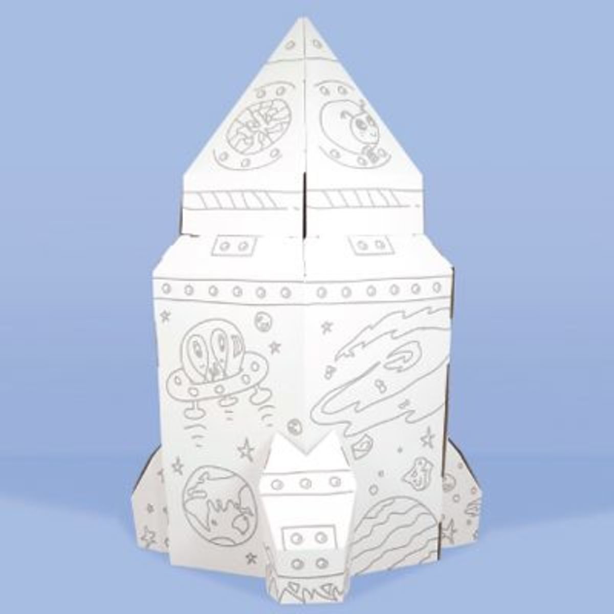 Die Rakete besteht aus 5-lagiger weißer Wellpappe, zum Zusammenbauen und Ausmalen. (erfordert weder Kleber noch Schere!)