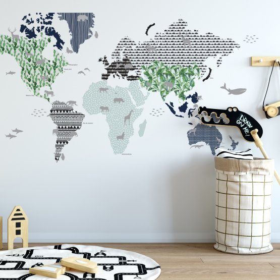 Die Karte ist auf einer speziellen selbstklebenden Folie gedruckt, deren Oberfläche mit einem matten Laminat bedeckt ist, das die Dekoration auch vor Schmutz und Verblassen schützt. Wischen Sie die Karte zur Wartung einfach mit einem feuchten Tuch und einem Reiniger ab. Zu den Dekorationen gehören auch Tiermotive. Die Dekoration bleibt mehrere Jahre an einer glatten Wand haften.