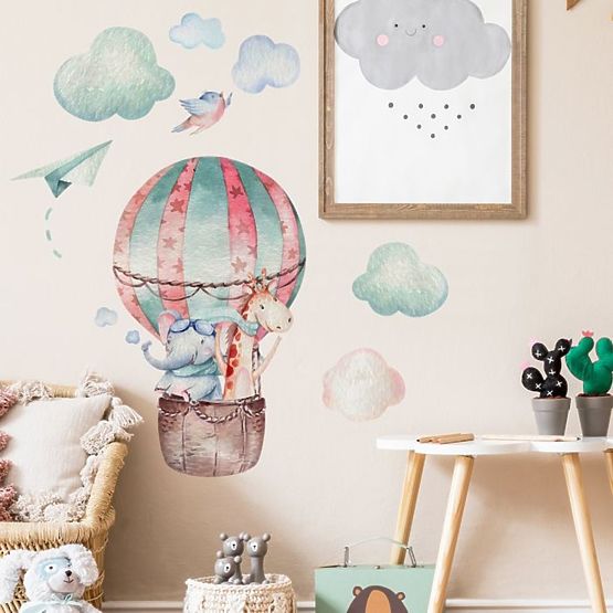 Schöner Aufkleber mit einem Heißluftballonmotiv, in dem ein Elefant und eine Giraffe sitzen. Der Aufkleber ist in hellen Pastellfarben gehalten. Beleben Sie Ihr Kinderzimmer mit niedlichen Wanddekorationen. Sie haben das Layout der Teile an der Wand in Ihren Händen. Wenn Sie den Spaß genießen möchten, beziehen Sie Ihre Kinder in die Dekoration ein.