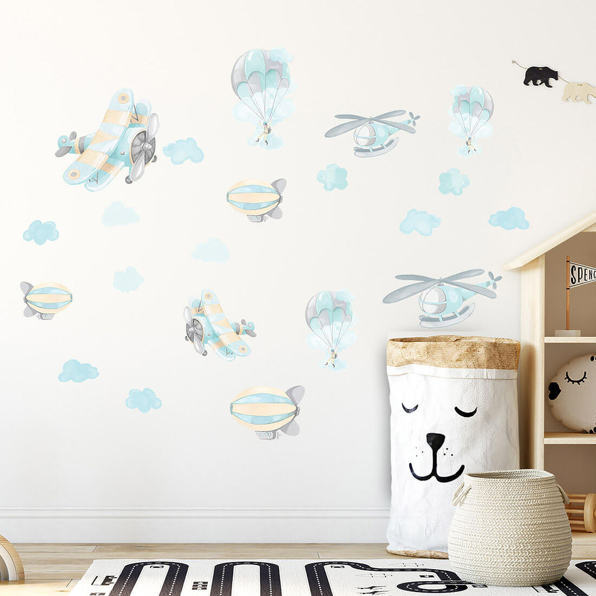 Ein Satz Flugzeug- Wandaufkleber in Blautönen ist eine großartige Möglichkeit, dem Zimmer Ihres kleinen Jungen Lebendigkeit und Freude zu verleihen. Die Blautöne schaffen zusammen mit dem Thema Flugzeuge, Luftschiffe, Hubschrauber, Gleitschirmfliegen und Wolken eine frische und luftige Atmosphäre, die Fantasie und Abenteuer anregt.