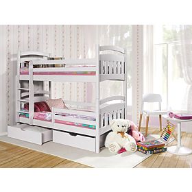 Sses schöne Etagenbett aus Kiefernholz in das Kinderzimmer zu schneiden. Weiße Magie Design, das Ihren Innenraum hellt und organische Beschichtungen und Barriere besteht aus der Krippe zu einem der sichersten und interessantesten Krippen, die She wählen können. - Bed eigenen Zertifikat "Institut für Holztechnologie in Poznan", die zum Verkauf ist Kojen Notwendigkeit in der EU - eine hohe Beständigkeit gegen Kratzer, Verletzung und Klimawandel durch drei Schichten aus hochbeständigen Lackoberfläche ist ausreichend hart - diese Farbe ist auch umweltfreundlich, antiallergisch und kein Geruch und ist in der Spitzengruppe ökologischen Lack "Umweltfreundliche E" Beschichtung enthält keine aromatischen Bestandteile (Toluol, ksylen) und keine krebserregende und andere toxische Verbindungen - Teil des Bettes 2 Polyurethan-Matratzen, Baumwollbezug mit Reißverschluss, die ihnen erlaubt einfache Reinigung, Zahnstangen und zwei Schubladen auf Rädern, die viel Stauraum bieten wird - ein wichtiger Vorteil des Bettes ist ein Möglichkeitsverteilung in zwei Einzelbetten - in der Größenordnung immer angeben, welche Seite She Leiter wollen - Tragfähigkeit des Bettes ist 80 kg / Bett Maße: 190 x 87 x 160 cm 208 x 97 x 160 cm