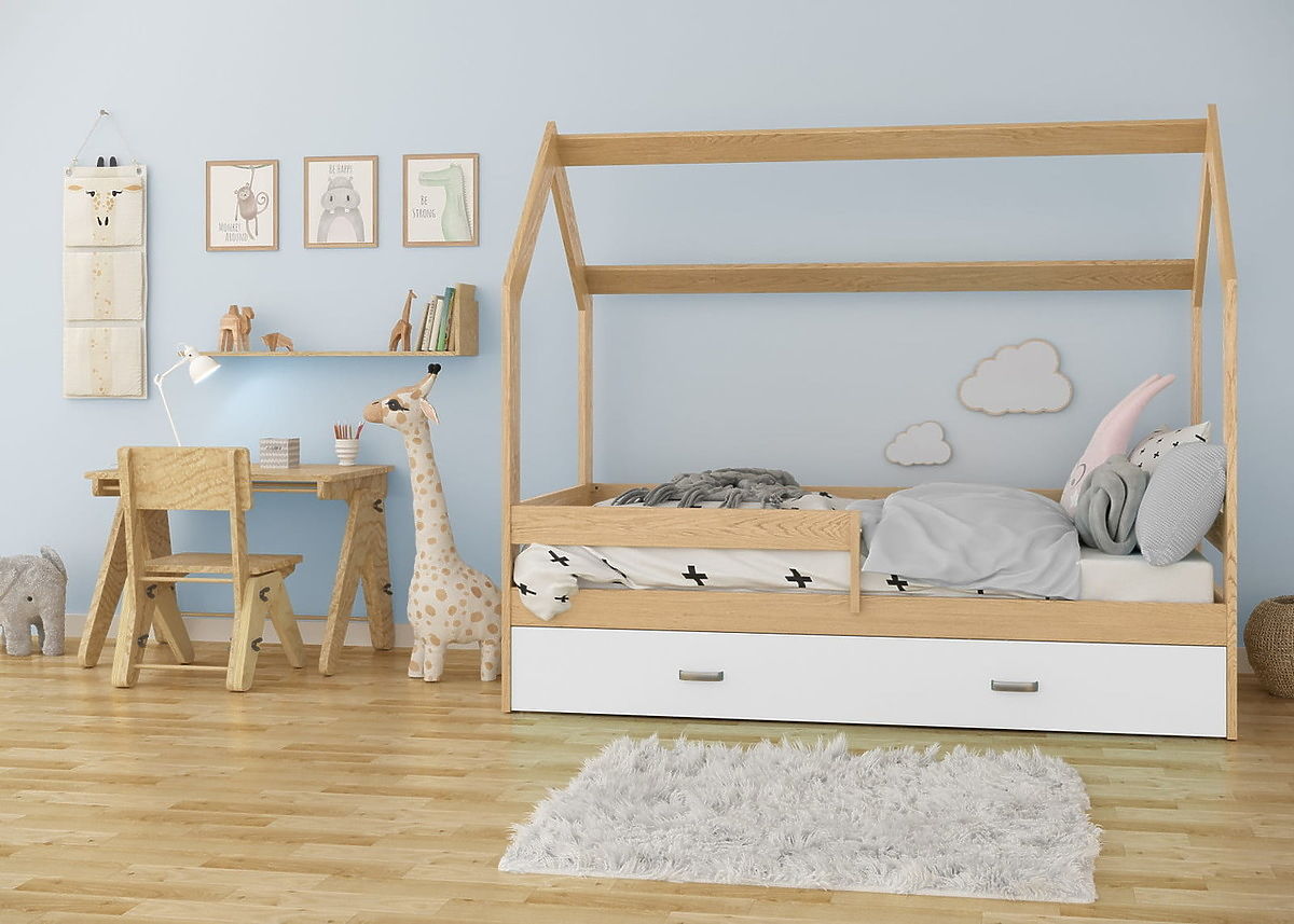 Das beliebte Kinderbett in Form eines Hauses mit Rausfallschutz in einfachem Design eignet sich dank seiner soliden und massiven Konstruktion (160 x 80 cm) nicht nur zum Schlafen, sondern auch zum Spielen.