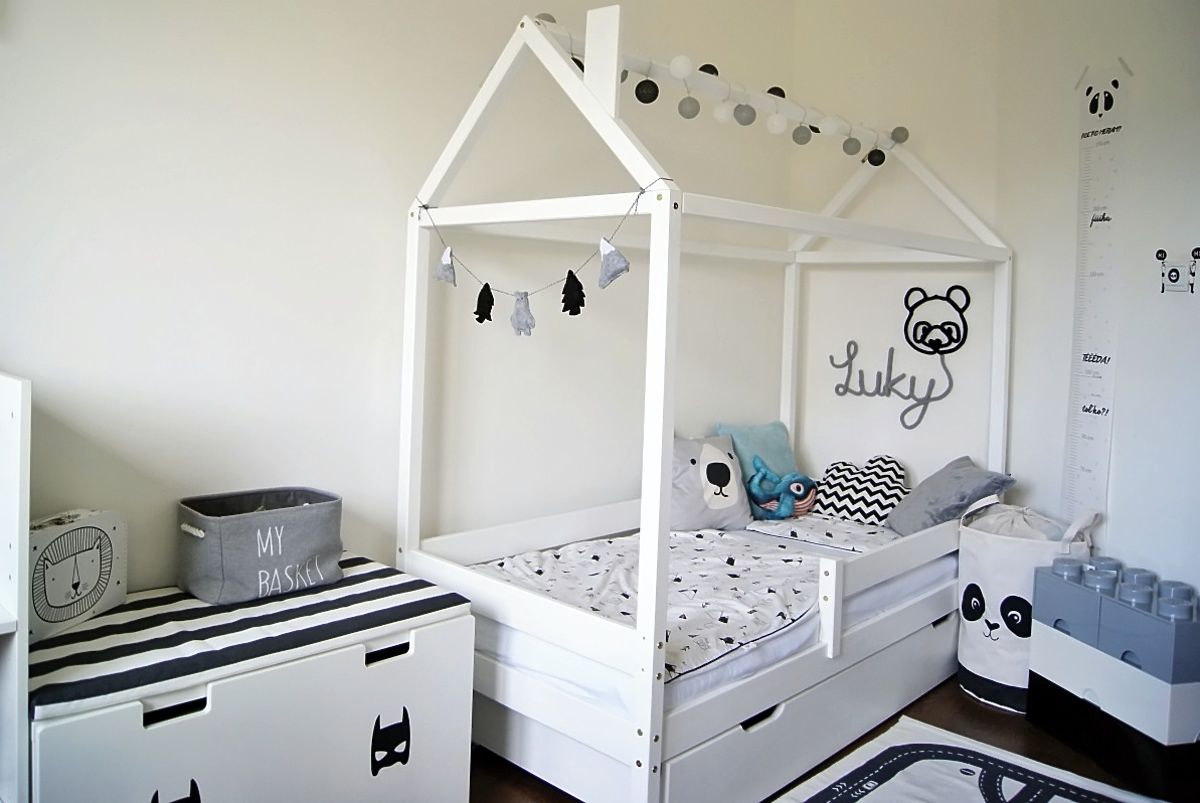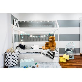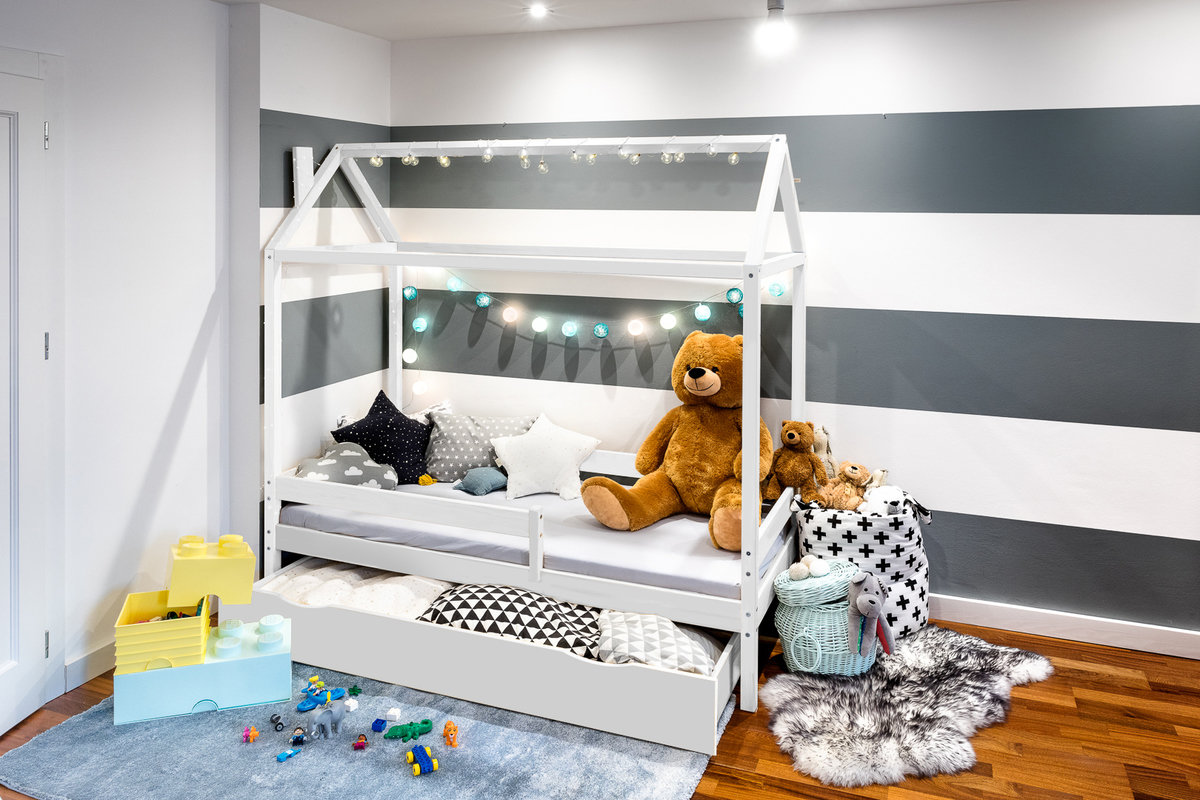 Die Hauskonstruktion über dem Bett lädt direkt zum Dekorieren mit verschiedenen Leuchten oder zum Erstellen eines von Kindern beliebten Bunkers ein. Wählen Sie ein Hausbett mit oder ohne Schublade.