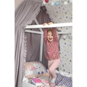 Das Bett ist sehr hochwertig und sicher. Neben der Abrundung aller Bettkanten schützt das Kind auch eine variable Bettbarriere. Beim Aufbau entscheiden Sie selbst, ob die Barriere links oder rechts sein soll.